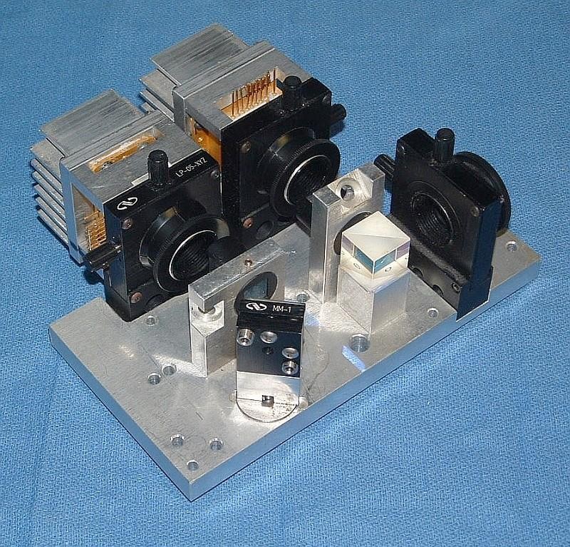 The lasing tests on the DPM1102 were initially performed using a Sony SLD322V pump diode (808 nm, 500 mW max, 50 um stripe width) with a pair of 12 mm f/1 lenses for beam focusing. The pump assembly was mounted on a Newport XYZ micropositioner.