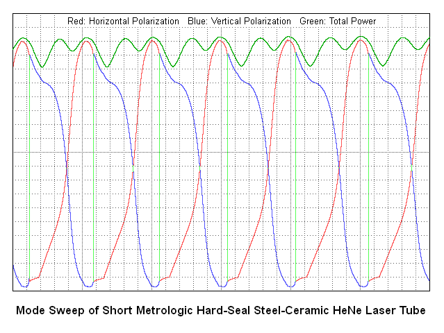 The HeNe laser tube is the classic Spectra-Physics side-arm design but with the anode electrode mounted less than halfway along the length of the bore. The same tube with the anode mounted at the end would produce around 4 to 5 mW. In fact, the Spectra-Physics 157 (3 mW) and 159 (4 mW) lasers are virtually identical except for the tube's anode location and the use of a larger power supply. (The SP-156 is likely similar as well but I haven't seen one to confirm.) This also means that the longitudinal mode structure and thus mode sweep will be similar for all these lasers.