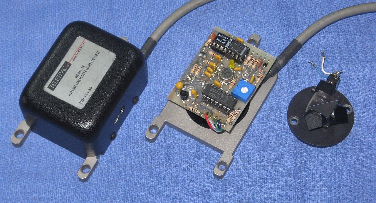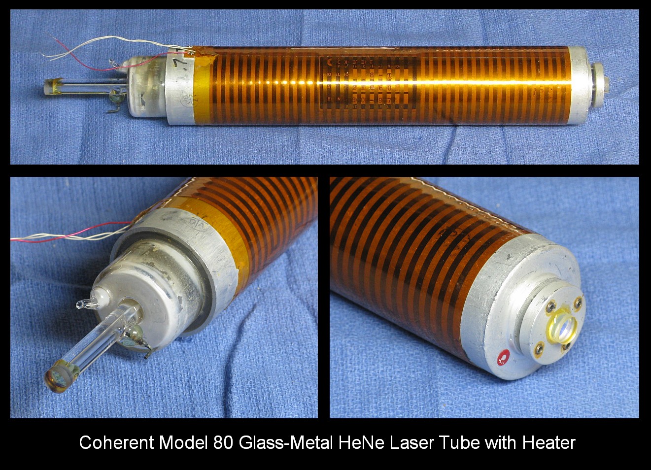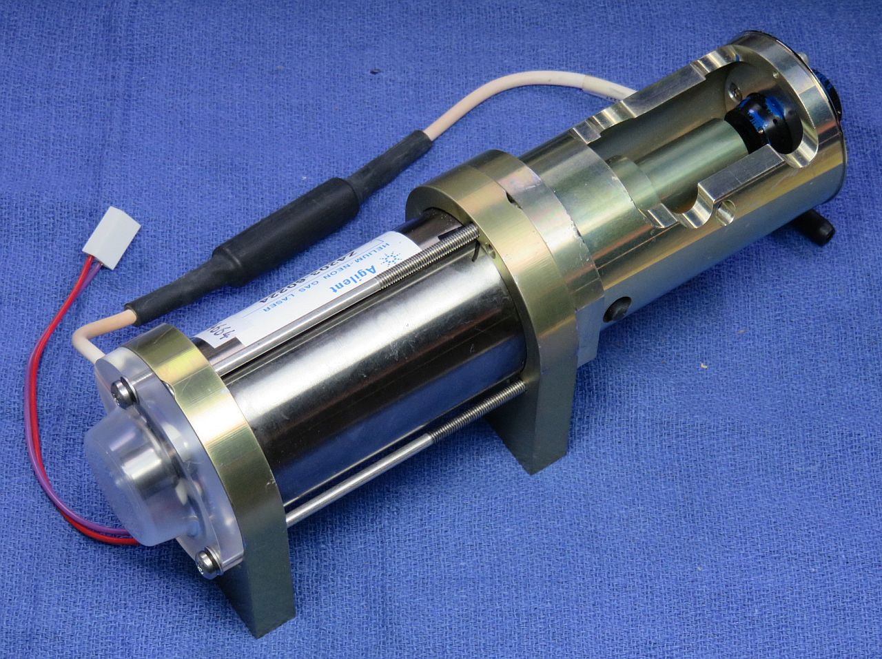 Although the label on the HeNe laser tube says Carl Zeiss, there is no doubt that it is made by Siemens: The model is LGR-7621-S, which is a current Siemens/LASOS model, and the remainder of the label is Siemens style. So, what about this is not clear? :) It is about 10 inches in length with anode-end output and a rated output power of 2 mW. (Its label also has the same irrelevant reference to Patlex patent number 4,704,583 as most HP/Agilent tubes discussed elsewhere in this chapter - and it is equally irrelevant for this one.) The normal dual mode thermal control technique is used with feedback provided by a pair of reflections from the uncoated surfaces of the roof prism - the one from the front, and the other through and back off the opposite surface. Polarizers oriented at 90 degrees select the two modes for the the photodiodes.