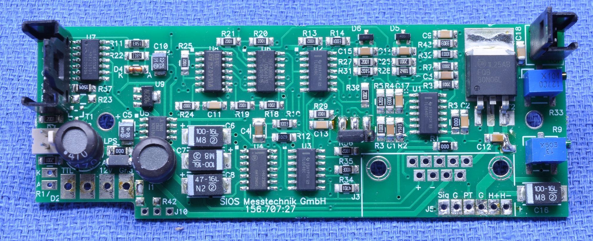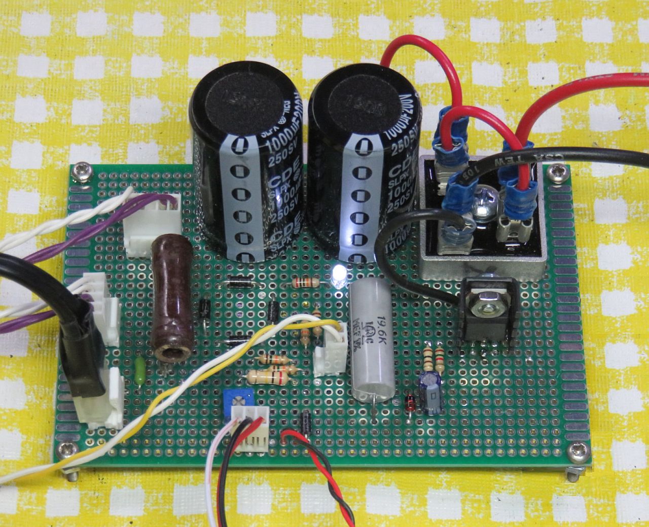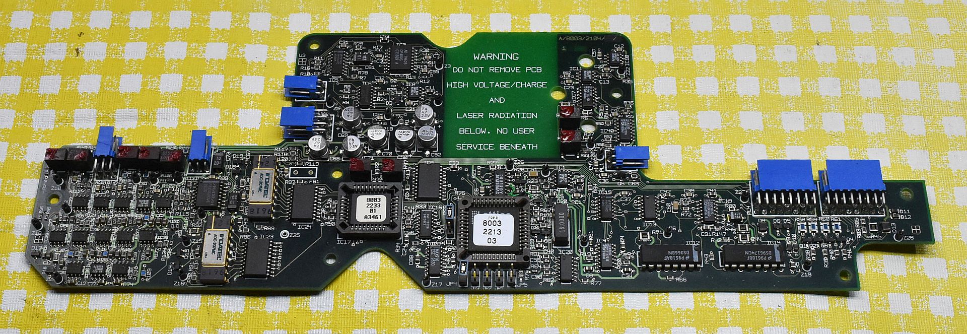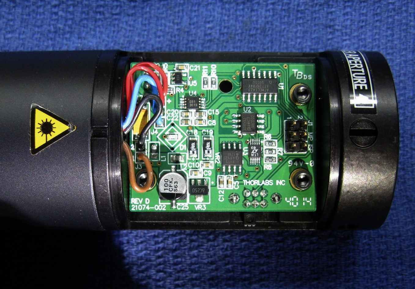 The entire controller is on the little PCB. Heat transfer to the environment is aided by the large heat-sink. Note the extra 1,000 µF capacitor, possibly added when it was determined that the HeNe laser power supply, which runs on 28 VDC, resulted in excessive droop on the DC power input when starting. The tube requires 5 mA at 1,300 V according to the LASOS spec sheet.