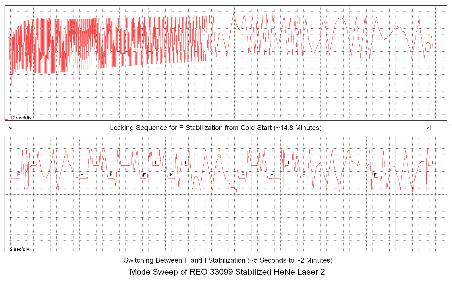 The time from one dropout to the next can be many hours so the only real way to detect this behavior is to run the laser on a data acquisition system that monitors the laser output power. Such a run is shown in Random Dropouts and Mode-Flips in a High Mileage Zygo HeNe Laser. This shows one polarized mode of a Zygo 7701 laser tube powered using an external HeNe laser lab power supply with nothing either active, so there is no stabilization and thus there is normal mode sweep. The dropouts have a duration of less than 1/30th of a second, though exactly how short they are is unclear due to the data acquisition sampling rate and input filtering. My guess is a few milliseconds. When a dropout occurs, there is a 50/50 chance that it will induce a mode-flip. Without stabilization, this results in a sudden change in output power. When the laser is locked with approximately equal power in both modes, there is no sudden change in power (or only a very small one), but then the laser relocks by going through a 180 degree change in the modes as shown in Zygo Laser Random Mode-Flip Event. This is basically the bottom half of the normal mode sweep that would be observed during warmup as in the previous plot - a dip of 20 or 30 percent of the locked power with a duration of 10 or 20 seconds. Both polarized modes will do the same thing.
