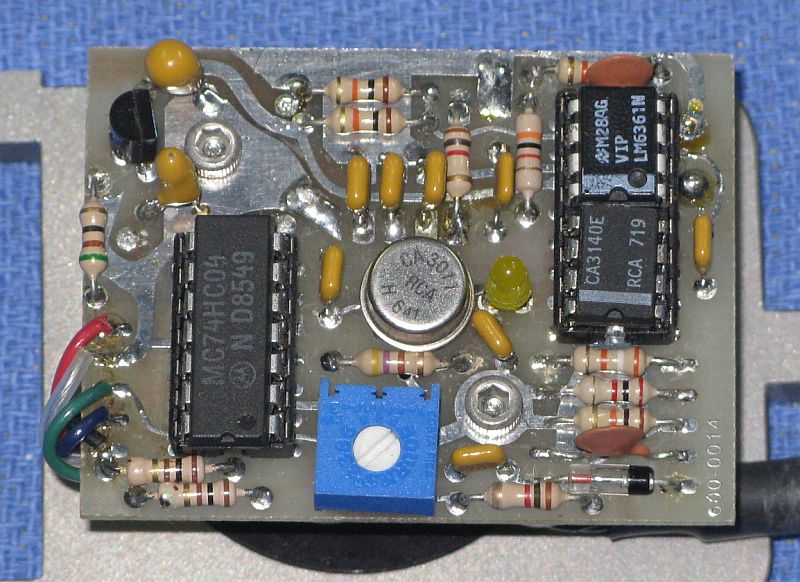 The optical input for testing was a red LED driven through a bridge rectifier made of 1N4148s (to double the pulse rate) from a function generator. As expected, the output was a differential signal with a response starting at about 150 kHz on the input. I haven't tested the high end yet, only to around 8 MHz, the (doubled) limit of the function generator. But the response appears very sensitive to signal level, much more so than with the HP/Agilent optical receivers. In fact, depending on signal level and offset (relative intensities of the positive and negative half-cycles for the LED), the output frequency sometimes equaled the input pulse rate and at other times was half of it.