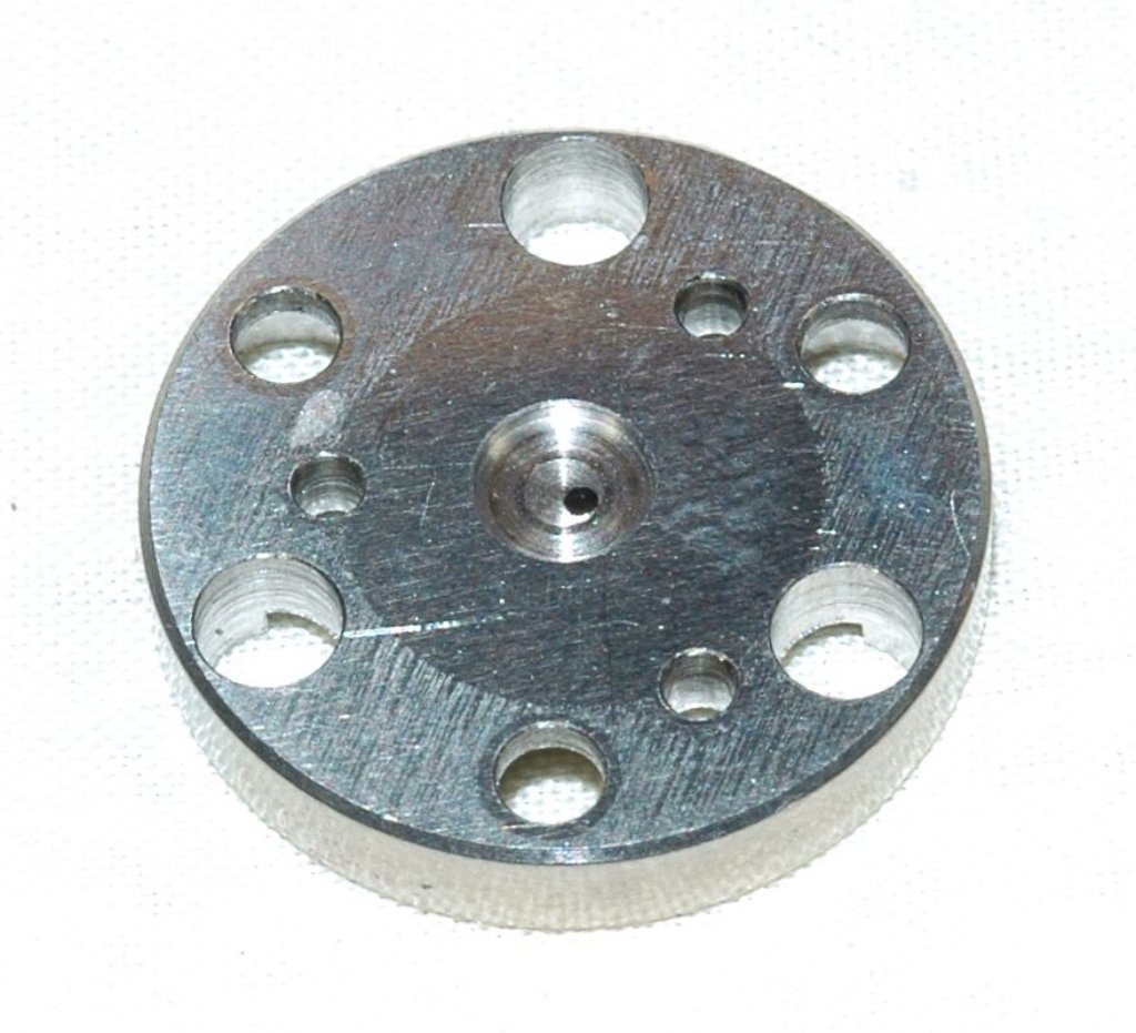 Brass Block with Pump Diode Beam Focusing GRIN Lens on mounted flush back and the lasing crystal on the front. Note the thin-film heater and wires for its temperature sensor.