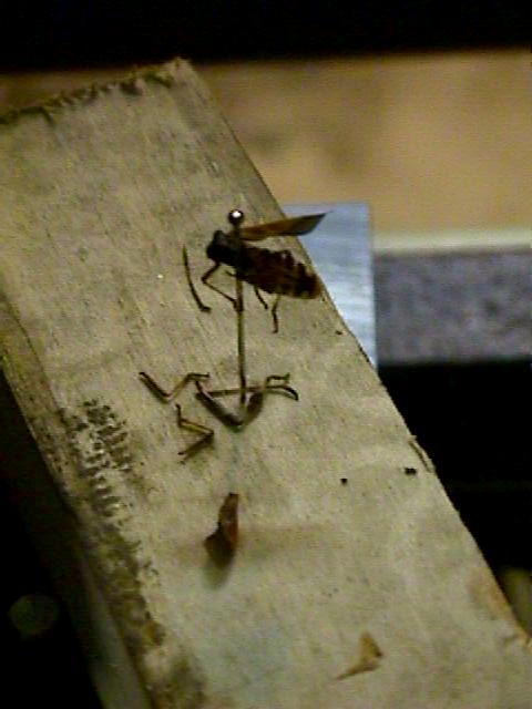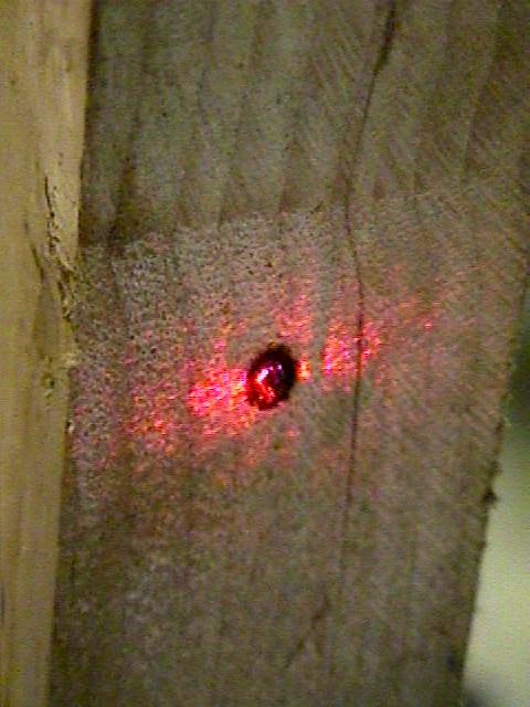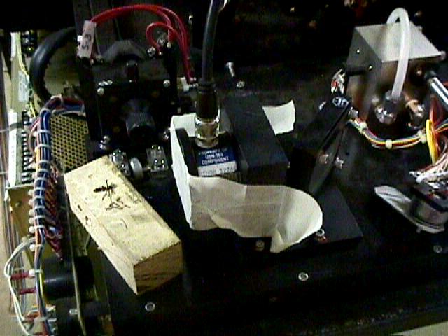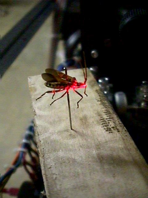 This unit which we affectionately call "BUGBLASTER SR" (not to be confused with its smaller relative) is made up of components of several laser systems including: Lasersonics 8000 Nd:YAG surgical laser, Spectra-Physics 3000 YAG pieces, 8 mW HeNe laser for beam positioning, optics from many different sources, and Mr. Stinkbug (from backyard). :-)