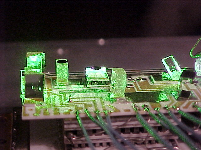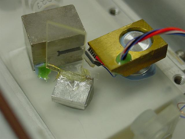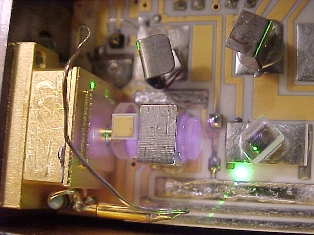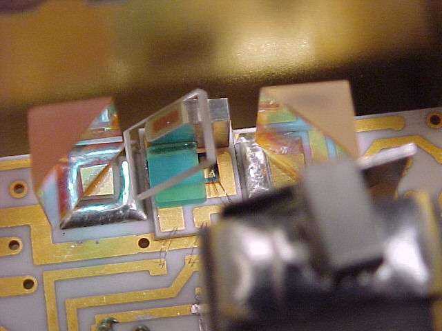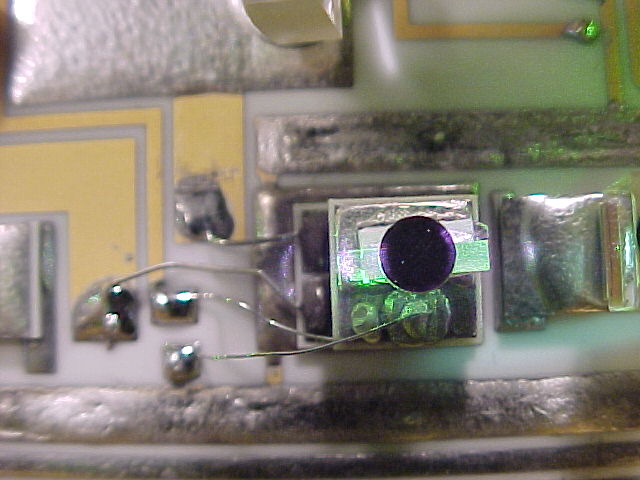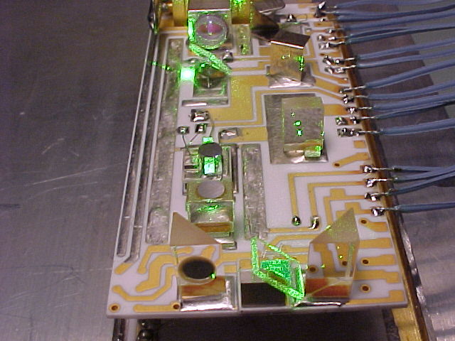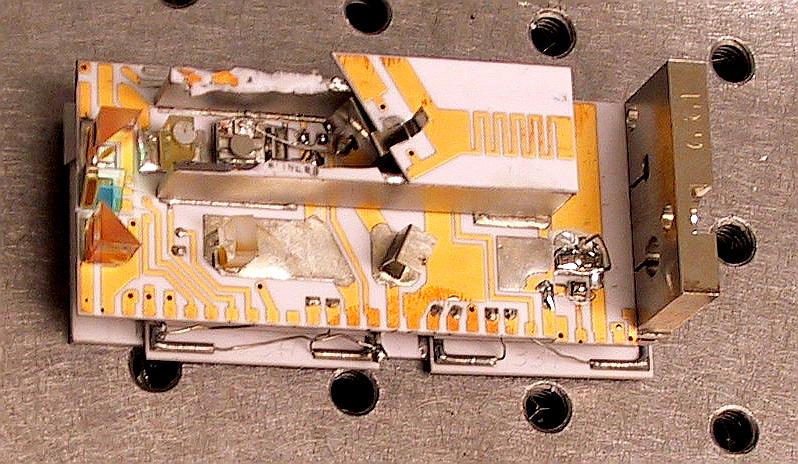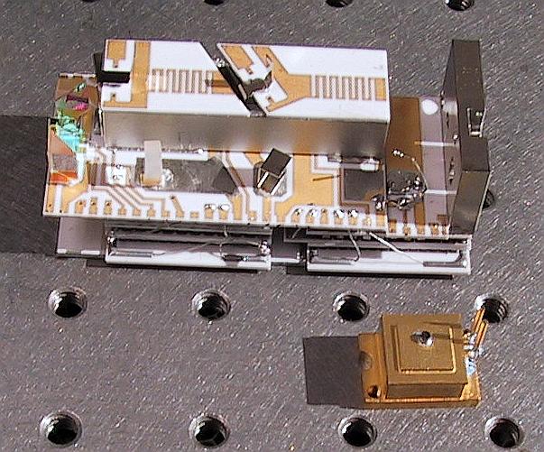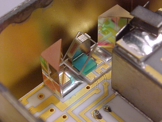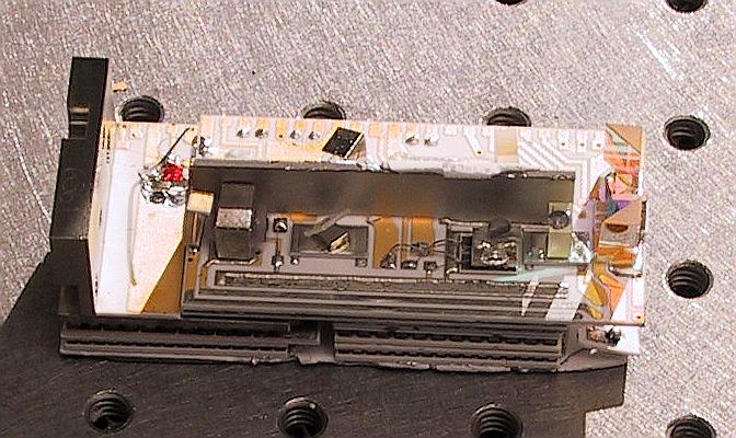 The only other structures you can see in the photo are the laser diode. (the gold box in the upper right hand corner), and the laser cavity - the ceramic box with the gold zigzags. Too bad I can't open the box without destroying the goodies inside. :)