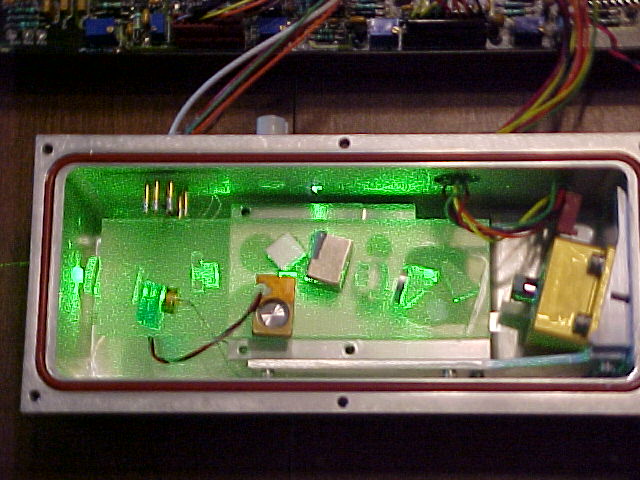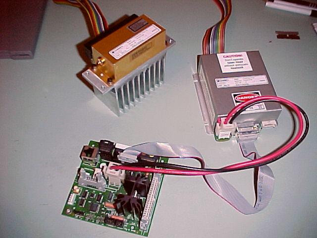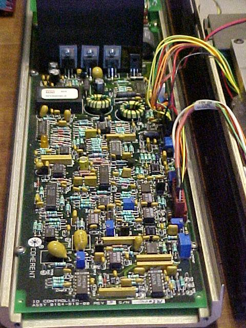 Here are some photos of the controller used to power the C315M laser. This unit includes the laser diode driver, three (3) TE controllers, and probably other circuitry to stabilize the laser. The last photo is of the PCB on the side of the laser. The settings of the pots on this PCB program the controller for the characteristics of the particular laser so nothing needs to be adjusted when swapping lasers.