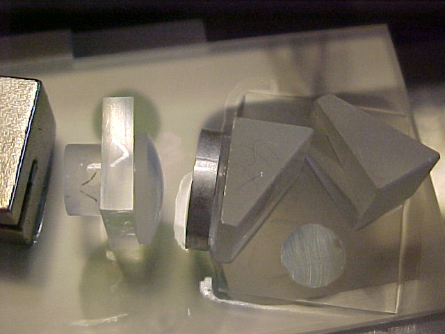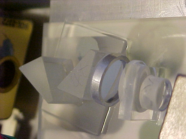 In fact, examining the carcass I have of the other C315M (above), it appears that many of the solder mountings really aren't done well - and this was a brand new unit just out of its original antistatic bag. The quality would be ranked below poor by the standards of electronic soldering. I know that the HR and YAG came cleanly off during the disassembly of the case. One wall of the cavity looks like it was broken off just by applying sideways pressure. Few of the soldered surfaces look properly wetted and I suspect that many would break between the optic and solder (as did the HR and YAG) rather than within the solder itself as expected of any respectable soldered joint. Perhaps they can't use normal flux because its vapors would coat the optics but there must be a way around this. Solder is good and stable if used properly but it can't be applied like glue!
