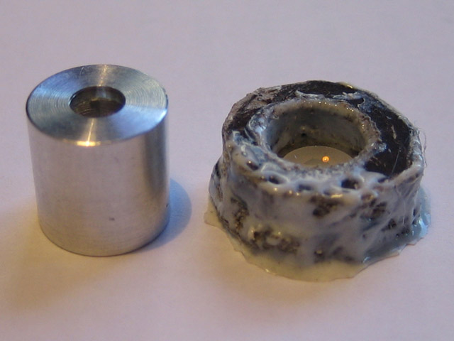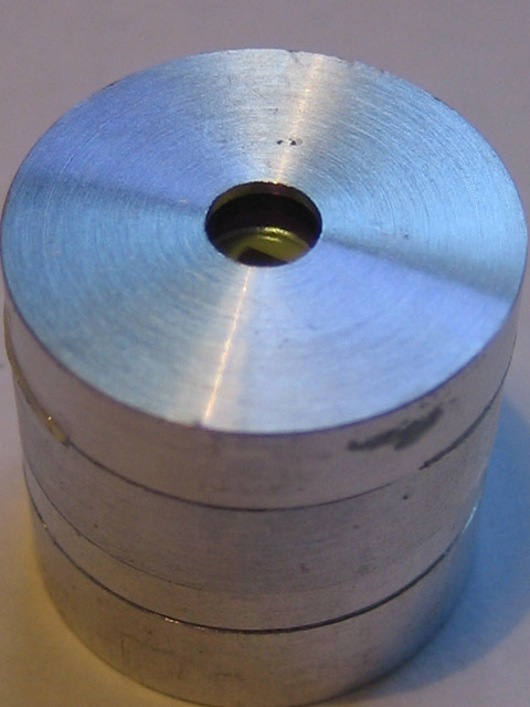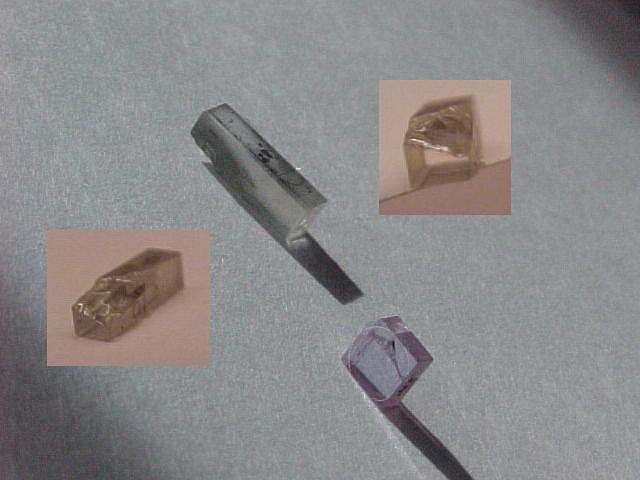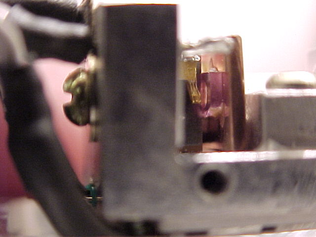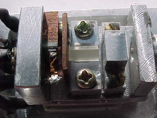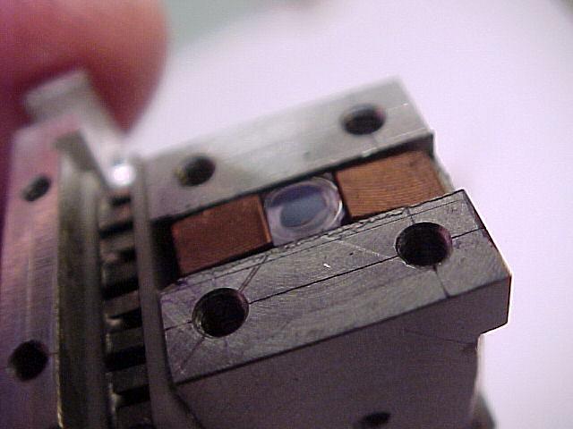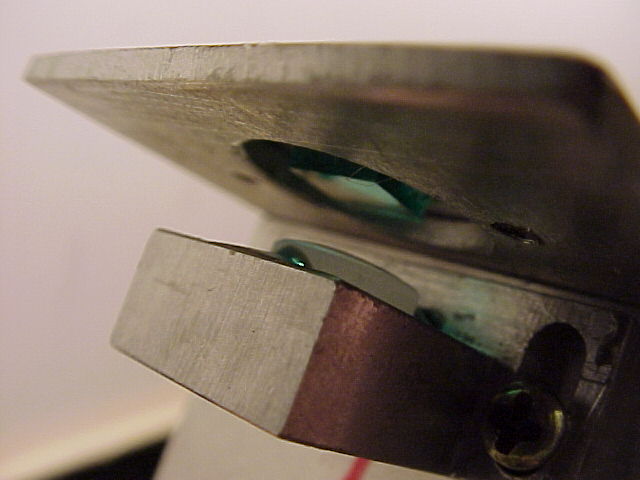 So, it would appear as though the laser was manufactured with a defective KTP. The YVO4 doesn't look that great either but at least the important central part isn't damaged. This was sort of a junky laser to begin with sloppy machining, wires falling off due to bad soldering, and just overall poor quality workmanship. The only outward sign of the cracked KTP was a misshapened beam. But once the laser was disassembled, the amazing part is how it actually worked in the first place!