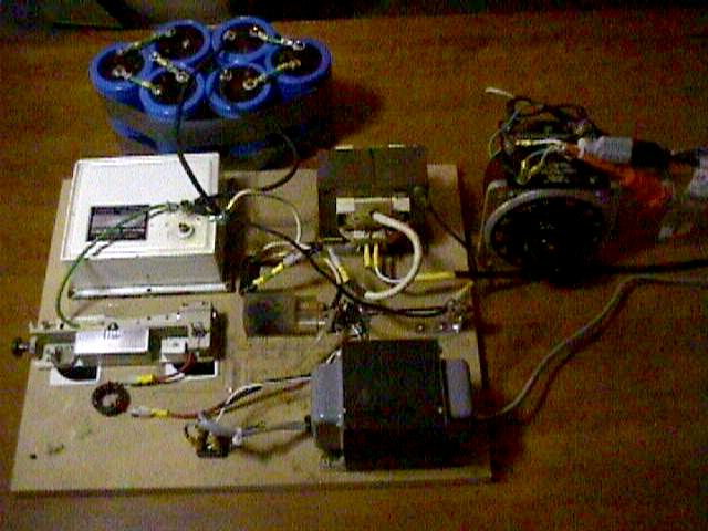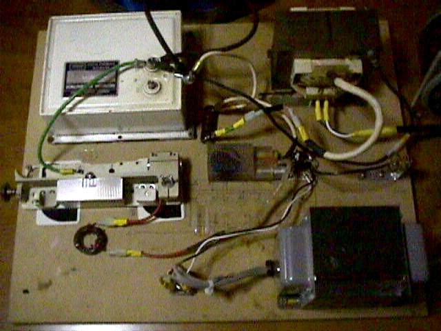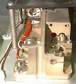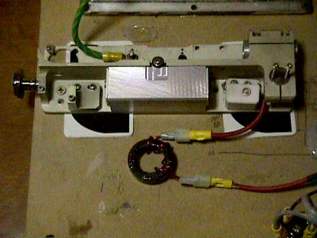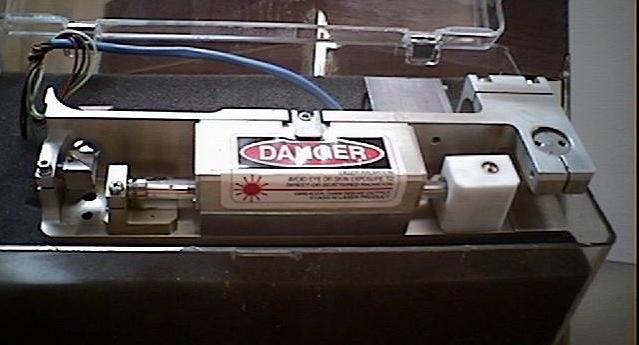 The laser assembly is sitting on top of a metal box. The metal box contains the high voltage trigger circuit. Looking to the far right of the box on top, you can see that rotating Q-switch prism. The small pin on the bottom of the shaft is the magnetic pickup. When the pin aligns with the Hall effect sensor, it will produce a pulse that is amplified and delayed by the proper amount to trigger the flashlamp firing SCR so that the prism will be in the optimal position to unspoil the cavity just after the end of the flashlamp flash. Once the prism rotates to the correct position with the HR and OC in alignment with the cavity....POW ! A super pulse. No easy task considering that you are dealing with a mechanical motor and I plan on doing away with it for now.