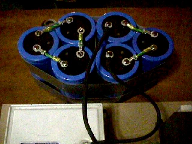 The pictures show a bank of (6) 2,900 uF, 400 V electrolytic capacitors. Three of these units (as the picture is shown) are wired in series for a net 966 uF, 1,200 V; six of them would provide 1933 uF; or if you require a different power density ratio, wire them in series groups of four caps for 725 uF, 1,600 V, and parallel two of these groups for 1,500 uF, 1,600 V. The white box in the picture is the original 150 uF, 1,250 V cap (not used).