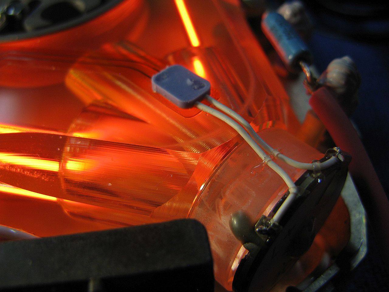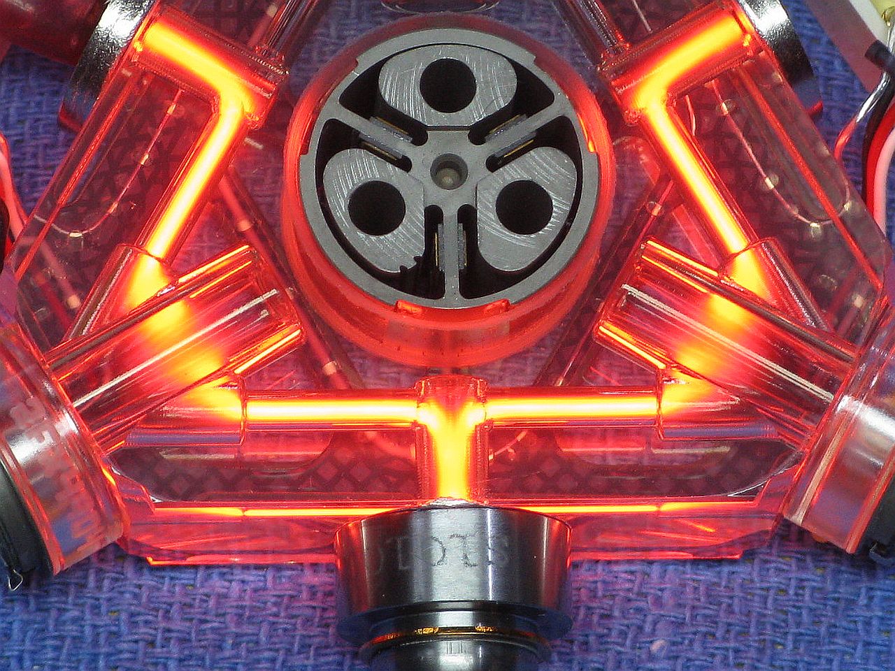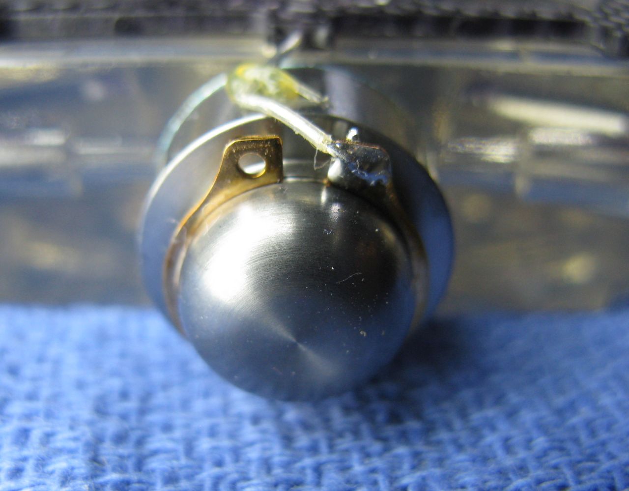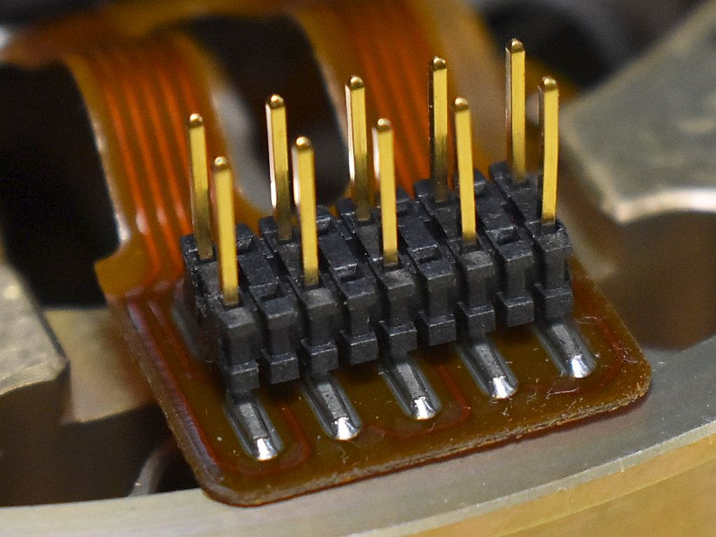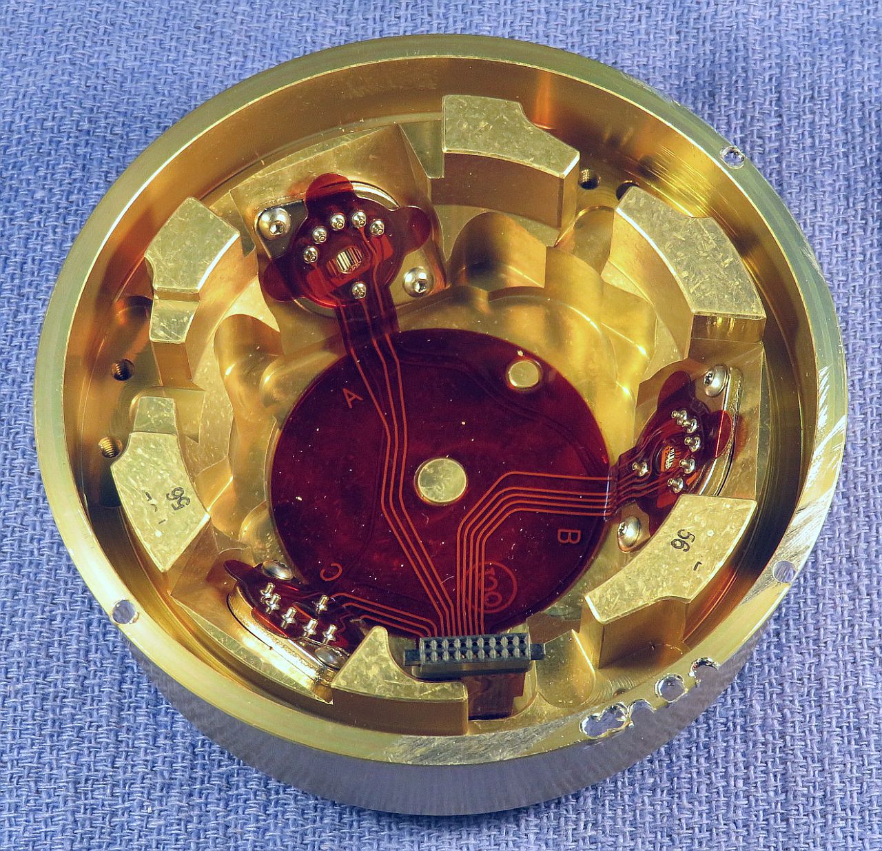 - GG1320 laser block bottom view. The black rubber webbing secures the various wires going to the white connectors. The dither motor (top and bottom) is the only point of rigid contact with the RLG structure.