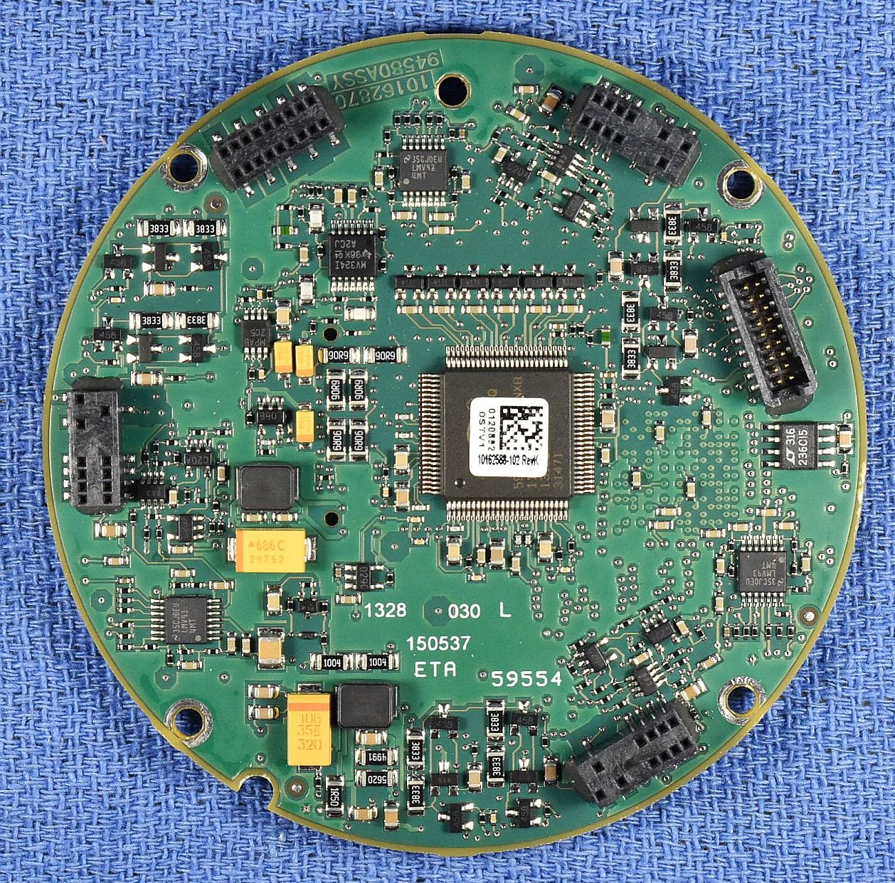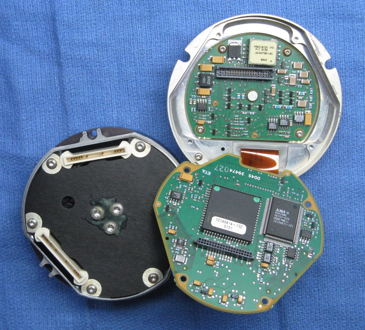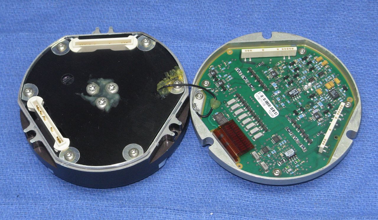 The Honeywell GG1320 RLG is used in numerous inertial navigation systems and is still considered state-of-the-art with a version in production as of 2018. Honeywell calls it a "Digital Ring Laser Gyro" as all the control electronics are contained within the 3.45", 1 pound package. Input is +5 VDC and +15 VDC, a Reset pulse, and Sample Request pulses. The status and angle data are returned via RS422. This unit is from 2001. The electronics are a bit different than what's shown in the current Photo of GG1320 Ring Laser Gyro in Honeywell Brochure. But from tests, it appears to be functionally identical.
