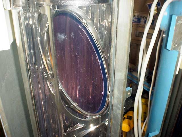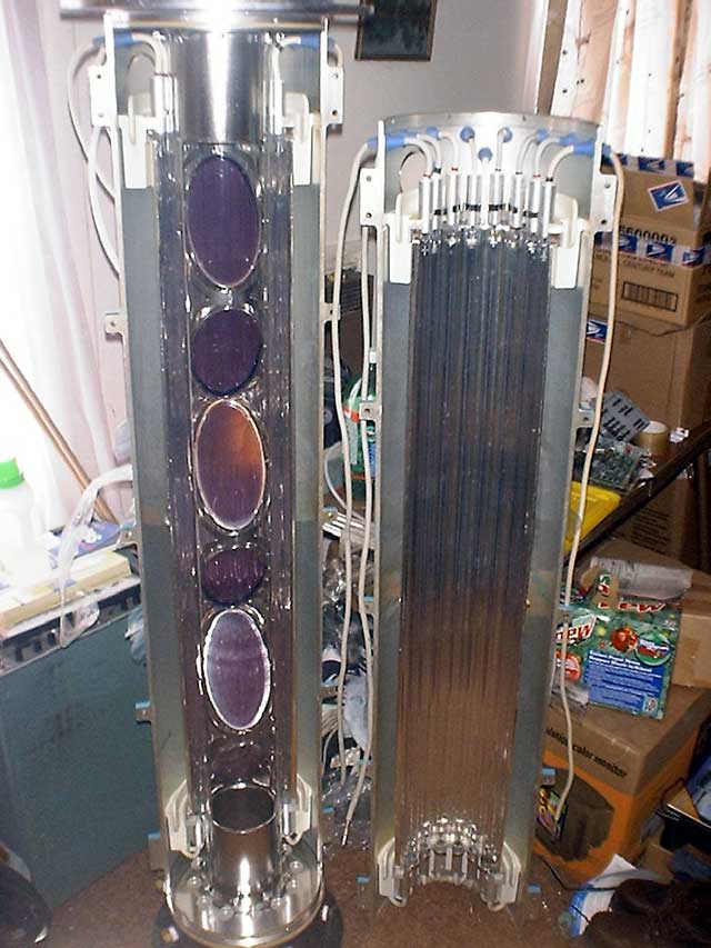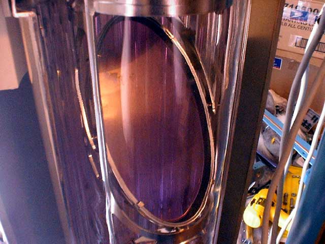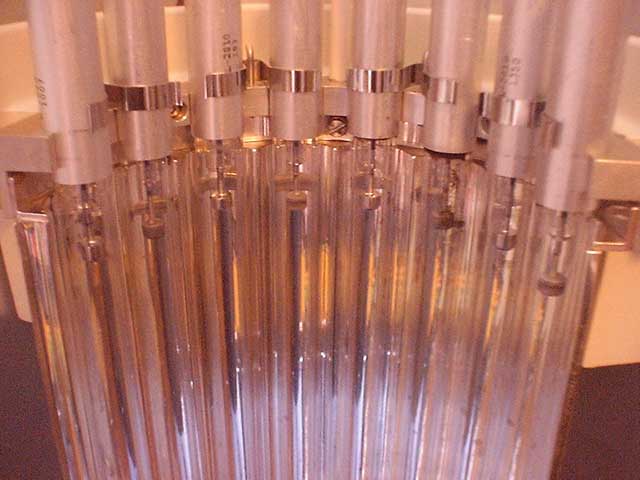 This appears to be a final Nd:Glass amplifier stage from one of the HUGE lasers constructed at the Lawrence Livermore National Laboratory. Originally I thought they were from SHIVA, which was the predecessor to the NOVA laser, currently the largest of its type in the World (and soon to be dwarfed by the NIF laser, which has recently seen "first light"). But I have been informed by Cole Paquette that they are actually from the LLNL Cyclops laser, a photo of which may be found at Cyclops Laser 1975 (Wikipedia). The unit consists of 16 flashlamps pumping 6 Nd:Glass disks set at the Brewster angle. The flashlamps were timed to fire just prior to the arrival of the light pulse from a previous amplifier stage.