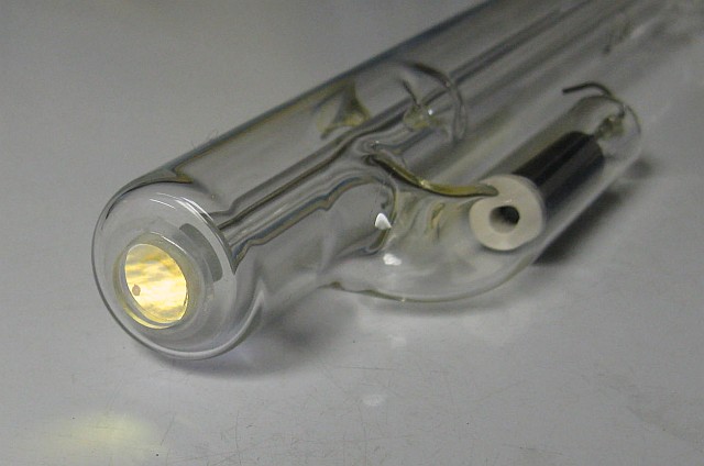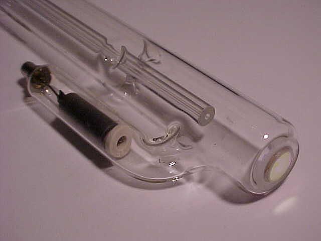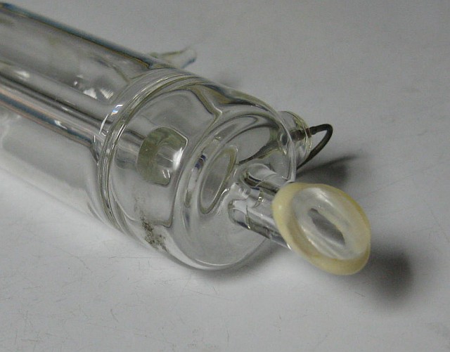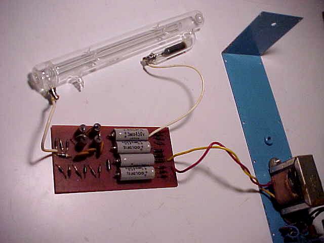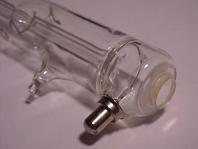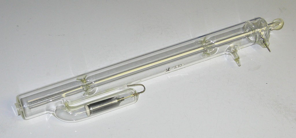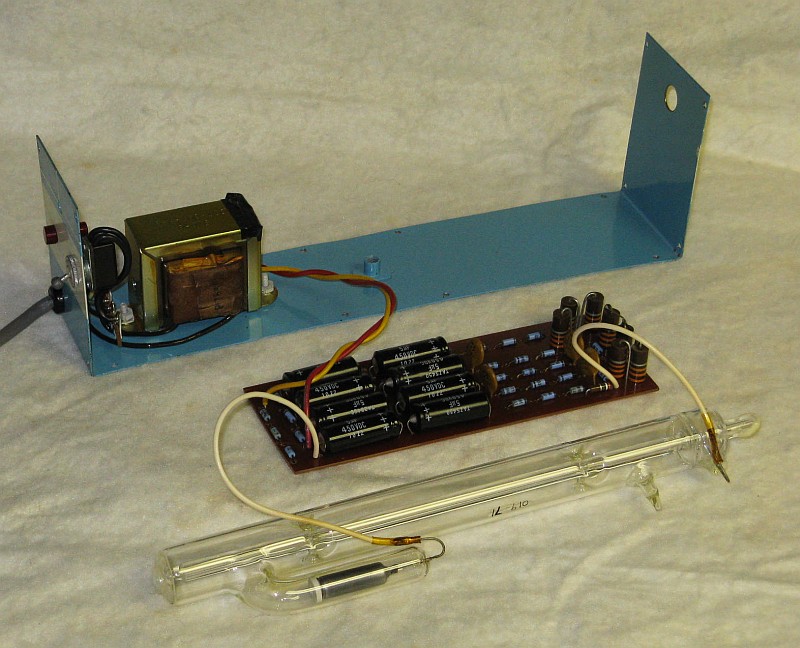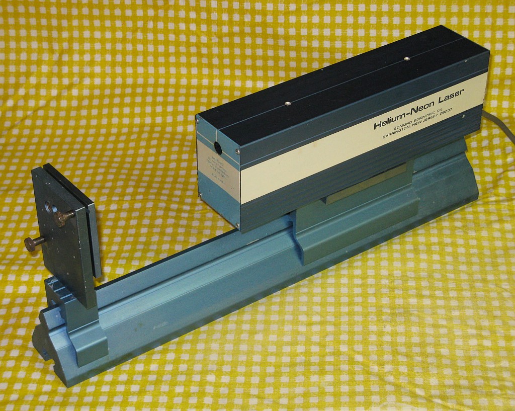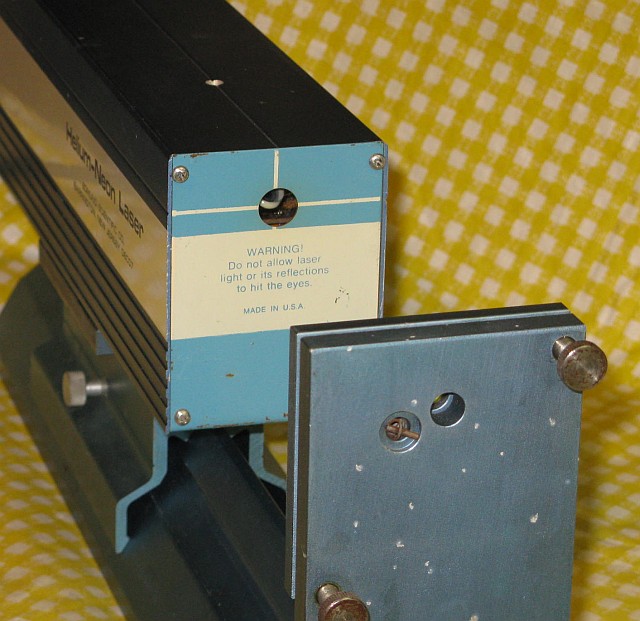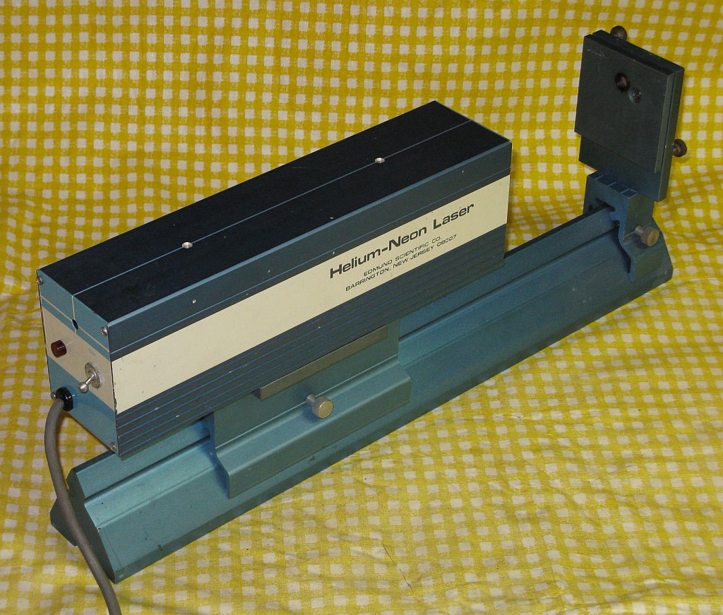 This setup has Edmund Scientific labeling but there is no doubt that it was manufactured by Metrologic. However, there is no model number of any kind. It uses a classic Metrologic J-tube but with an internal HR mirror and Brewster window at the other end instead of an OC. The J-tube uses a neon sign electrode for the cathode, but may even predate the other more common internal mirror J-tubes since it simply has thick wire leads rather than caps for terminals. The power supply is a simple transformer/reftifier/filter with no regulation similar to the one in the ML-360, above, but runs at a higher voltage. Thus there are double the number of capacitors and more components elsewhere. The laser and external OC mirror on a kinematic mount are attached to an optical rail to permit their spacing to be varied. Although the rail, laser mount, and mirror mount appear in 1976 and 1979 Metrologic catalogs, the laser itself does not. So, it must be early 1970s or before. There are also no dates anywhere on or in the laser.