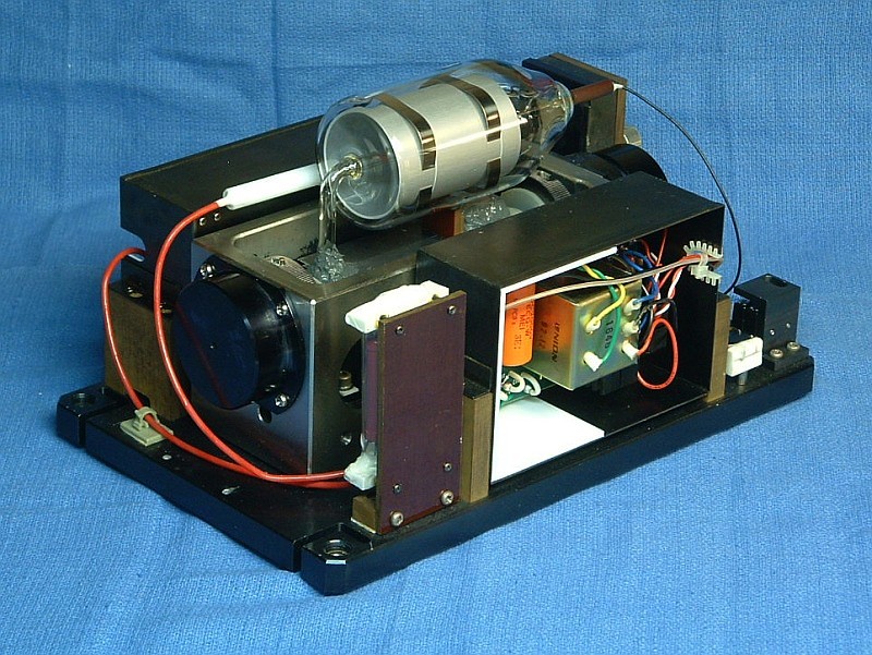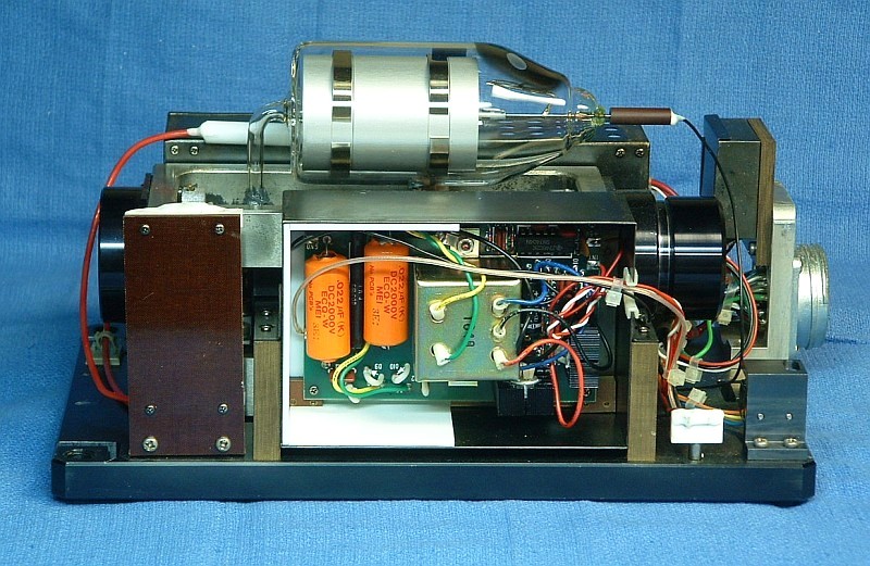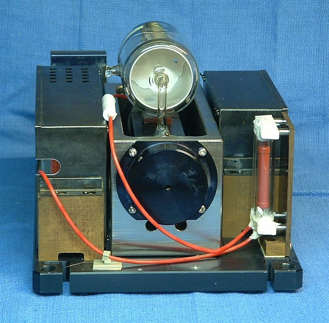 large gas reservoir and cathode of the HeNe laser tube is at the top,