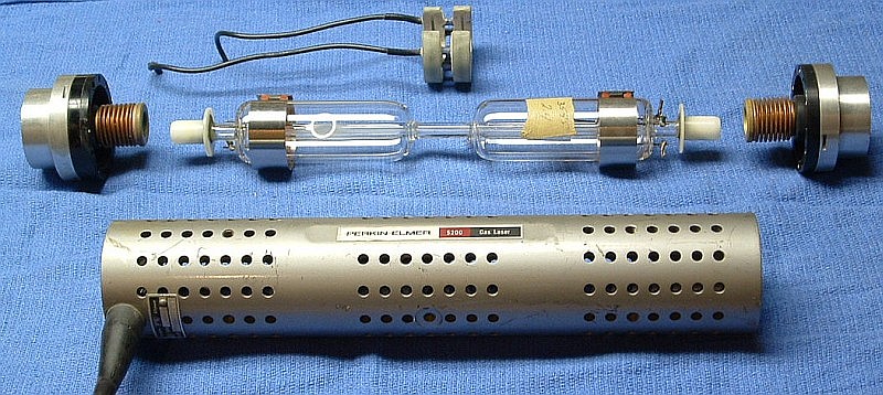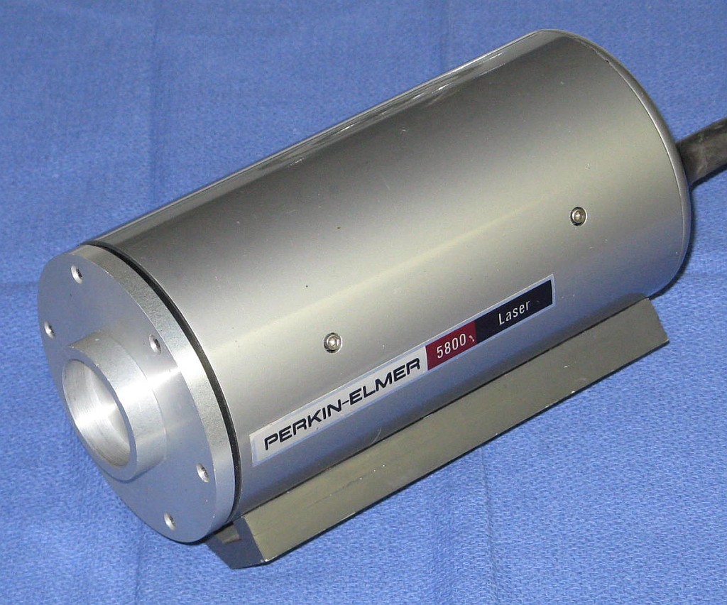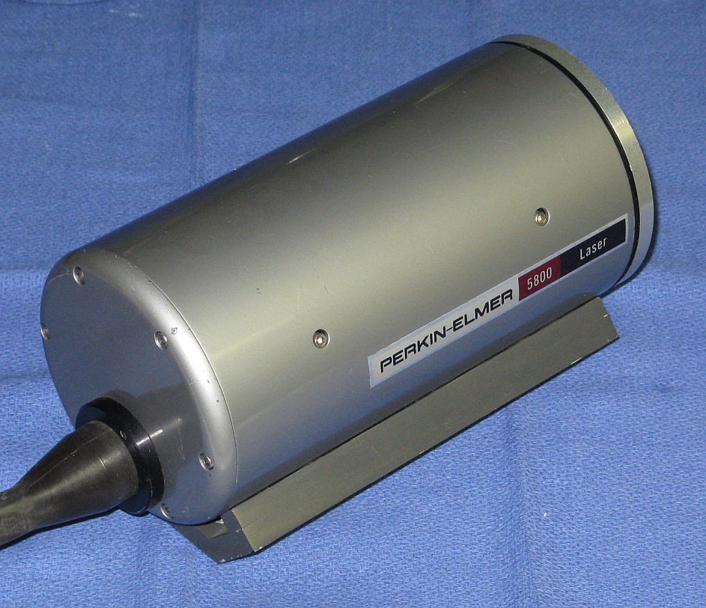 The principles of operation but NOT the internal construction for the Perkin Elmer 5800 stabilized HeNe laser is covered in U.S. Patent #3,793,595: Single Frequency Stabilized Laser.