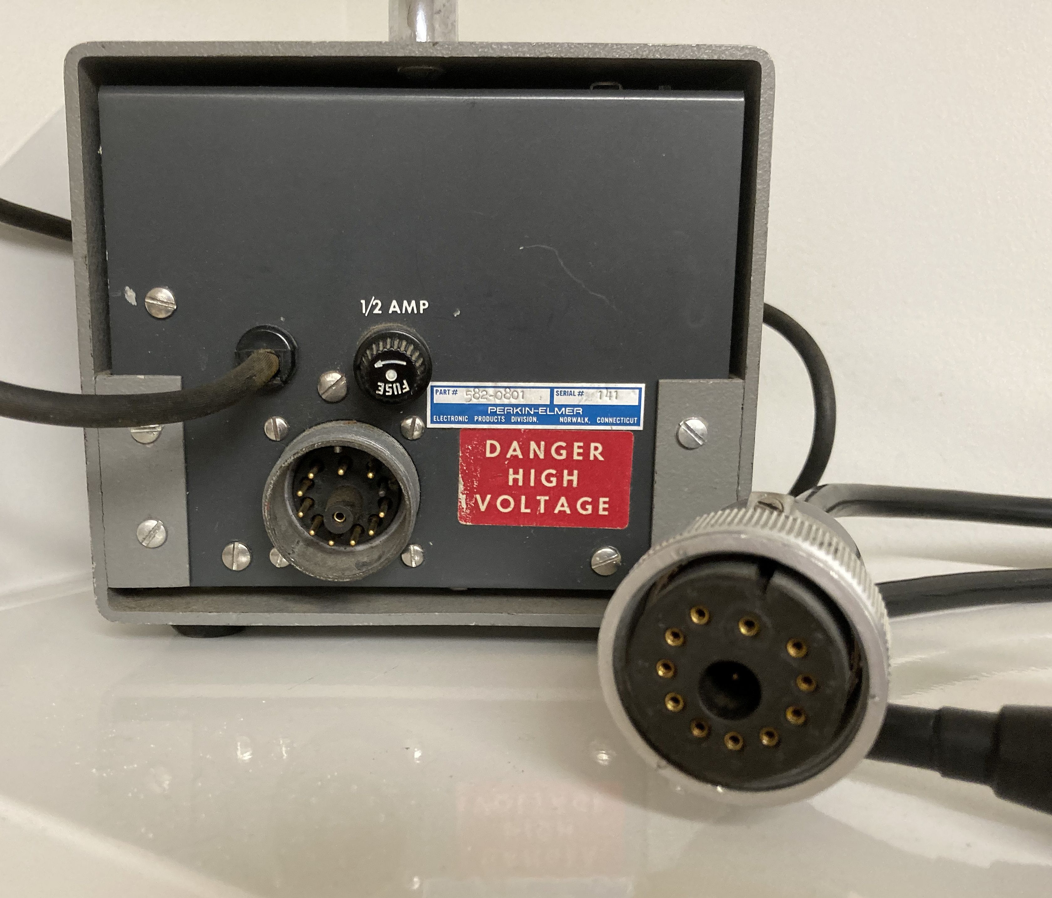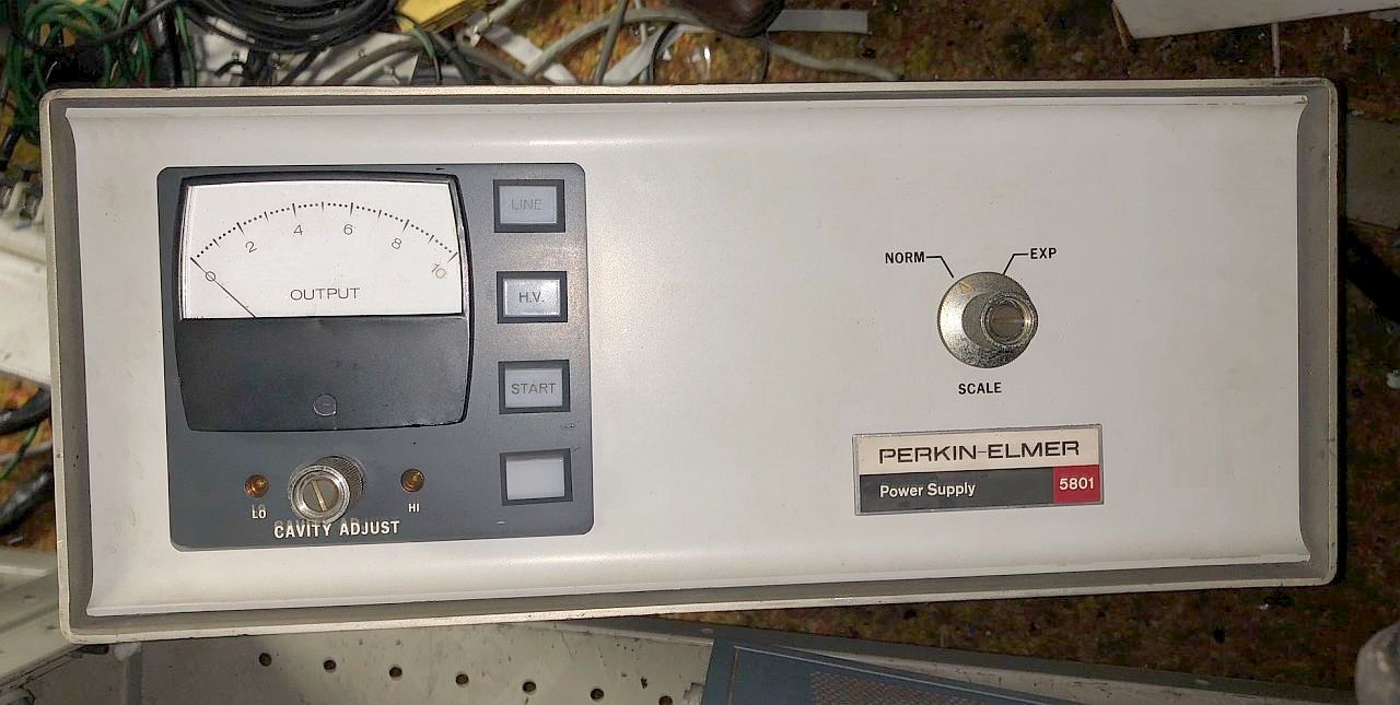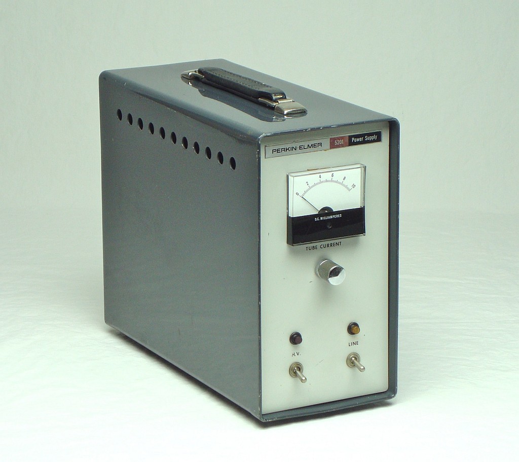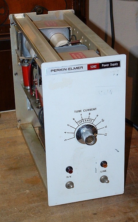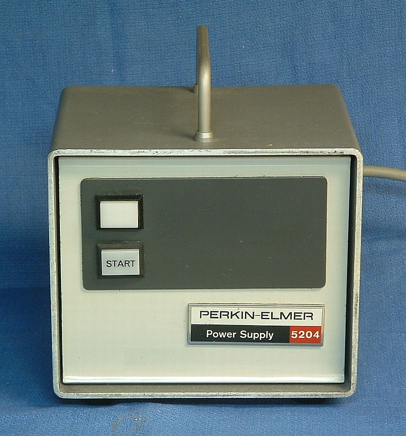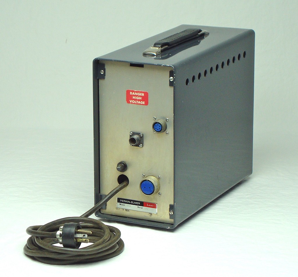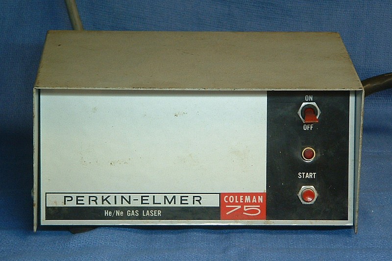This is a very early model Perkin Elmer HeNe laser power supply. The identify of the mating head is unknown but based on a 1968 brochure, it had a minimum rated output power of 1.0 mW (1.5 mW typical), divergence of 0.8 mR (full angle), and an expected life of 4,000 hours. The cost of the system in 1968 was $295.
