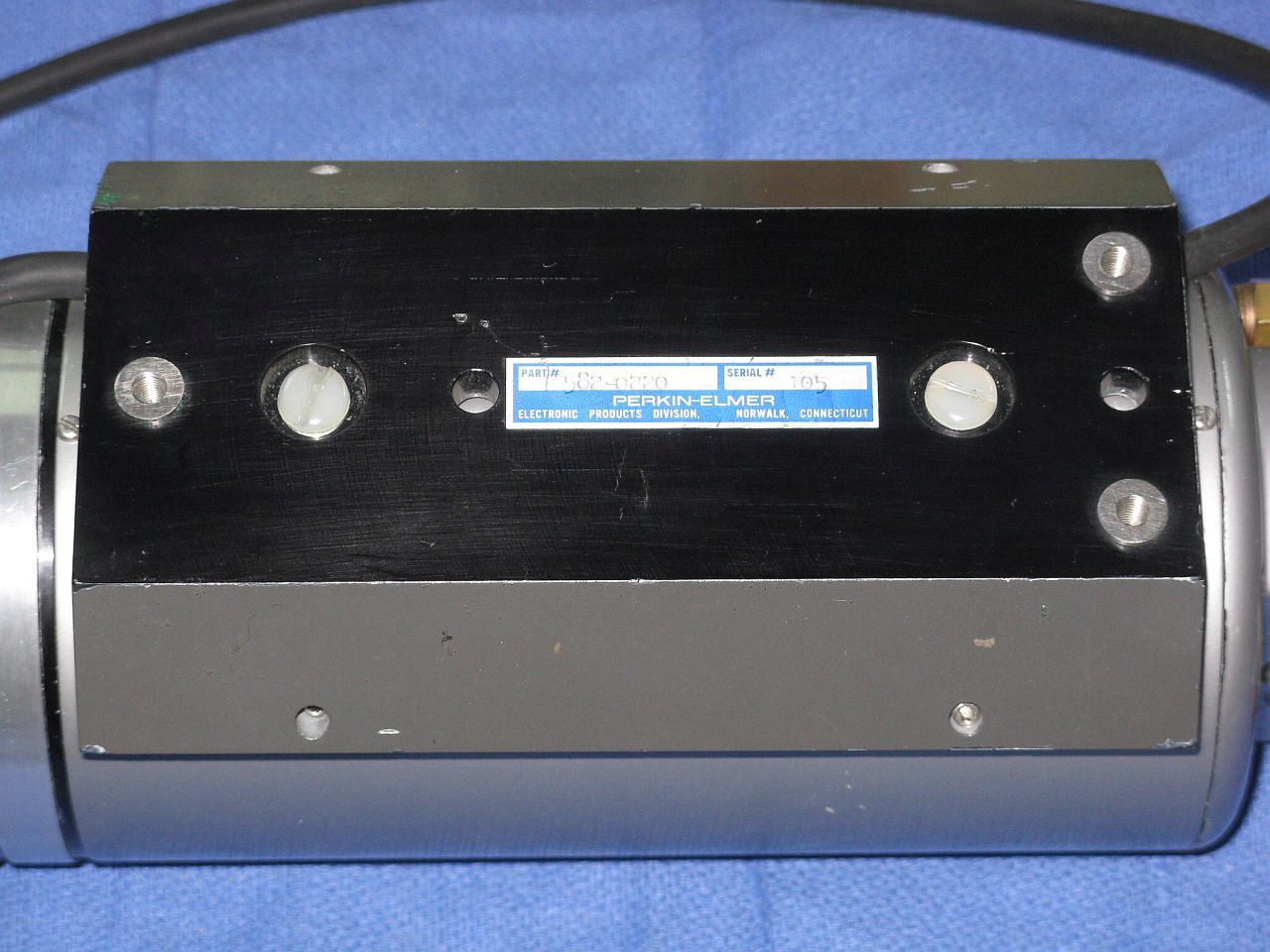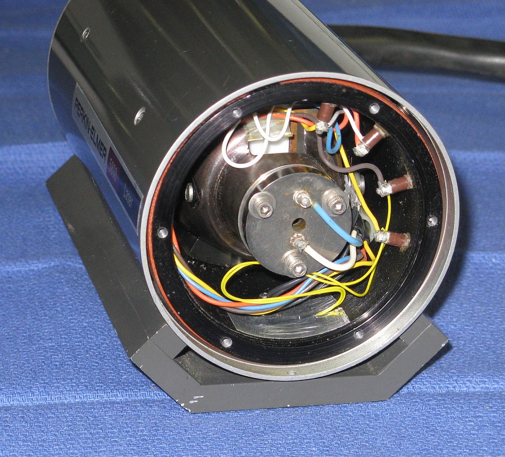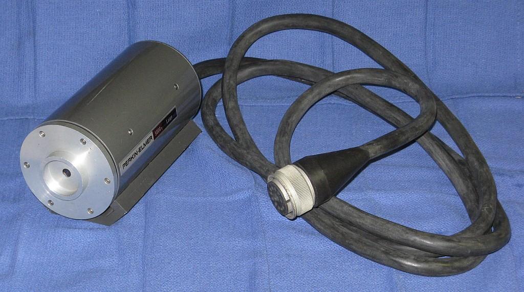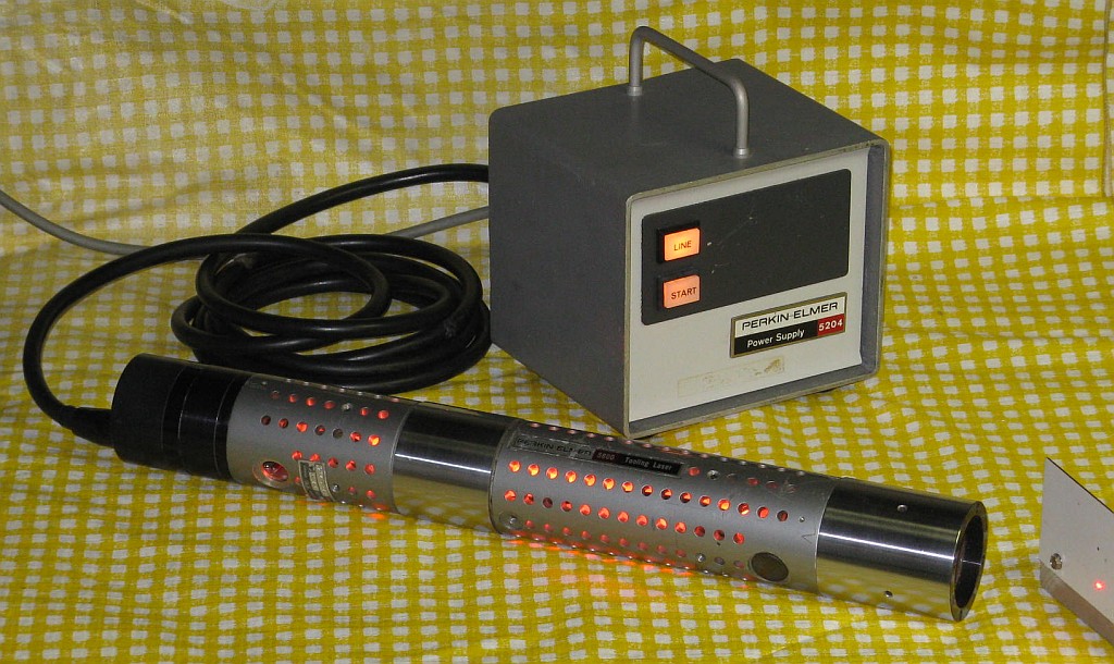 The is a stabilied HeNe laser head made by Perkin Elmer. It consists of a two-Brewster tube with a heated filament in a short squat laser head sealed enclosure. A separate large controller/power supply attaches via a cable the thickness of a garden hose. The locking scheme is not known definitively but is believed to be Lamb Dip based on the presence of both a heater and PZT. (Power supply photos courtesy of Bob Arkin.)