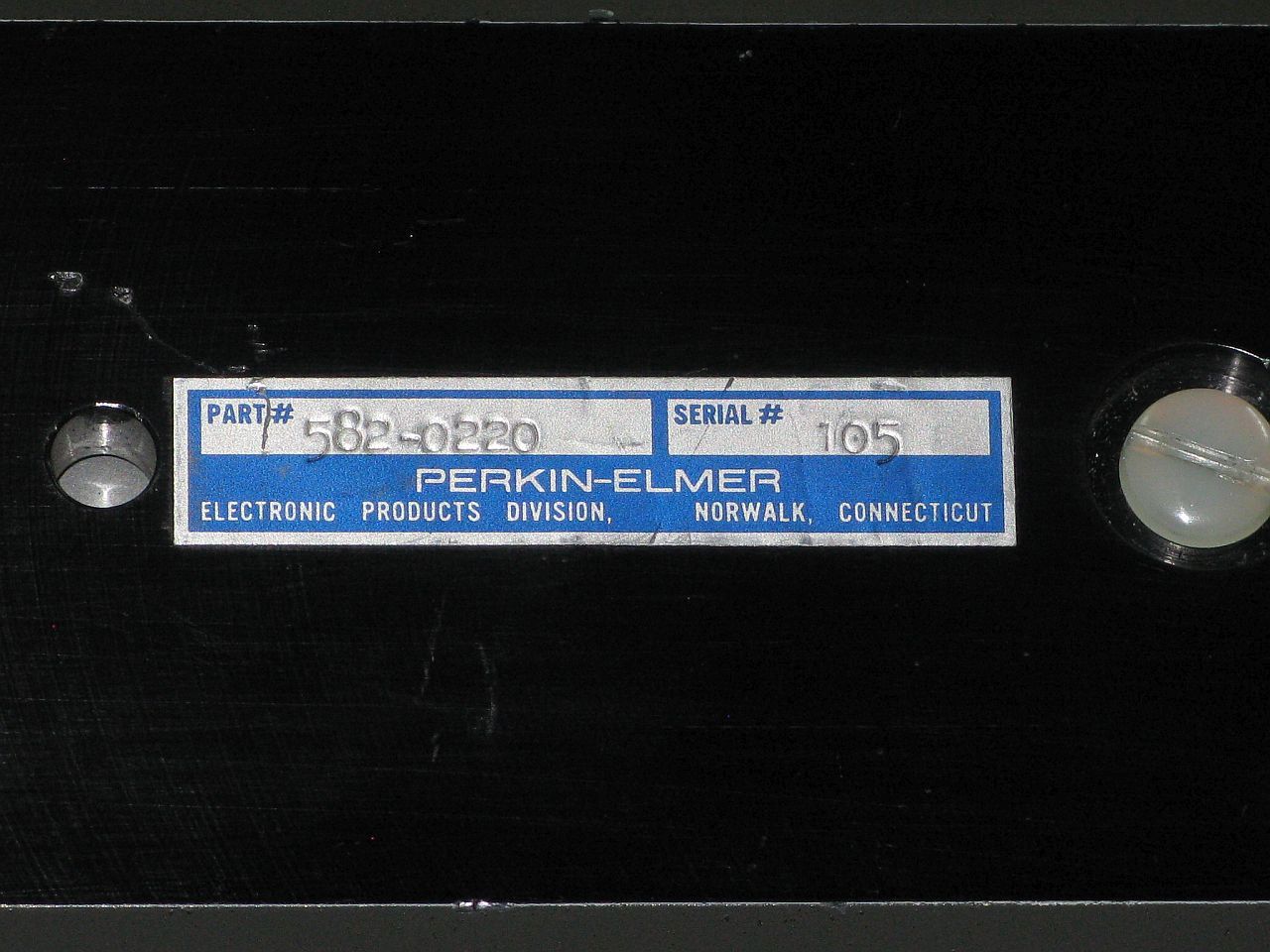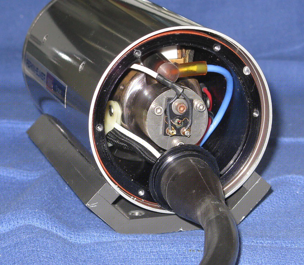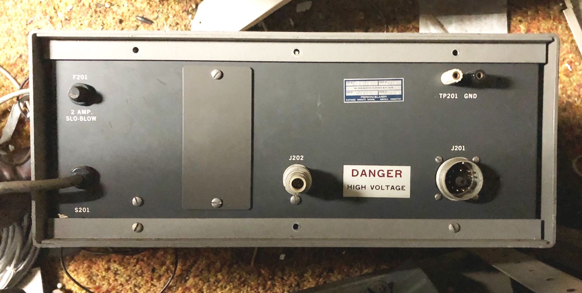 The is a stabilied HeNe laser head made by Perkin Elmer. It consists of a two-Brewster tube with a heated filament in a short squat laser head sealed enclosure. A separate large controller/power supply attaches via a cable the thickness of a garden hose. The locking scheme is not known definitively but is believed to be Lamb Dip based on the presence of both a heater and PZT. (Power supply photos courtesy of Bob Arkin.)
