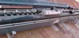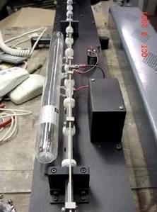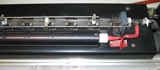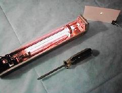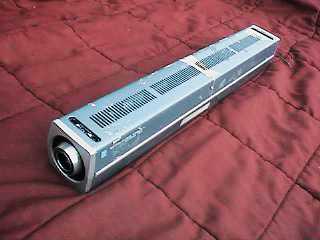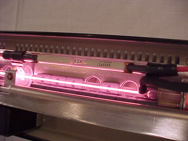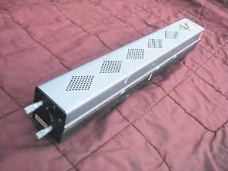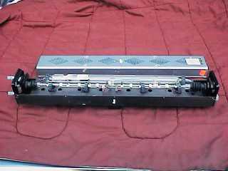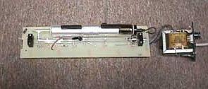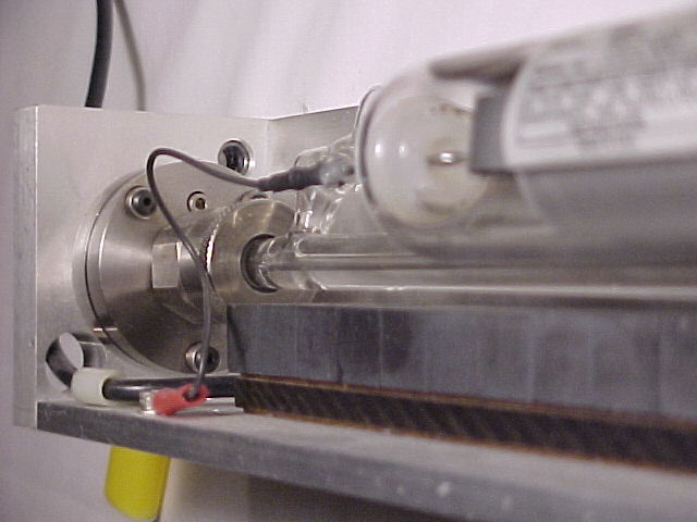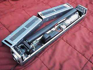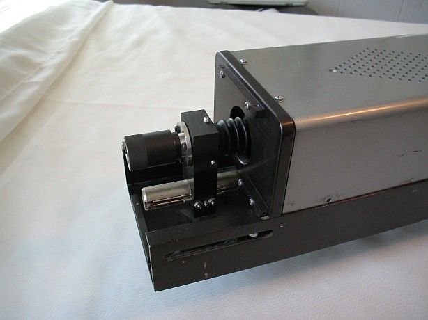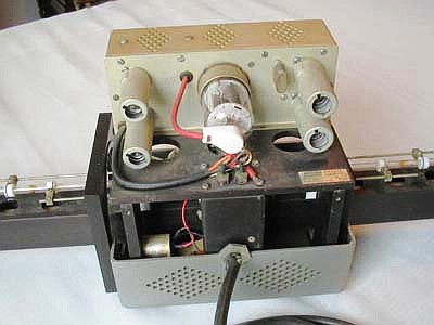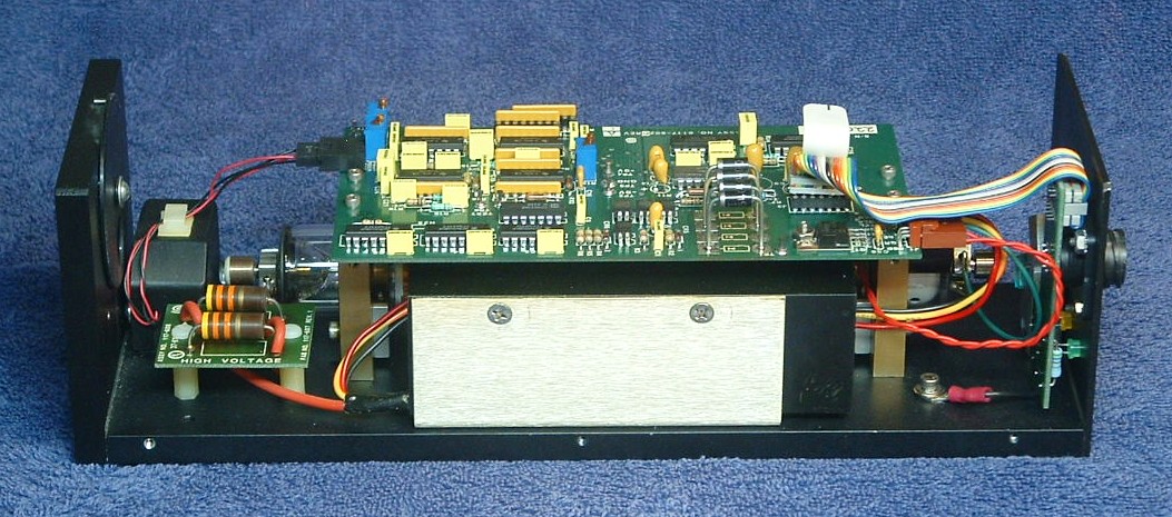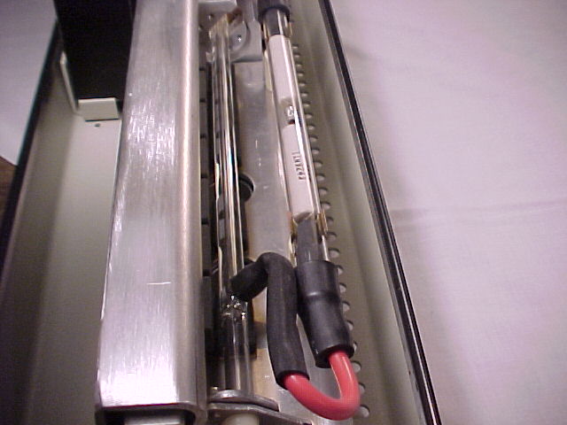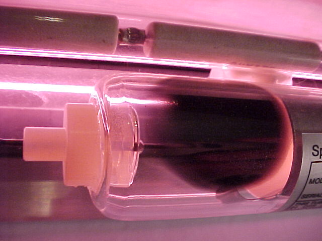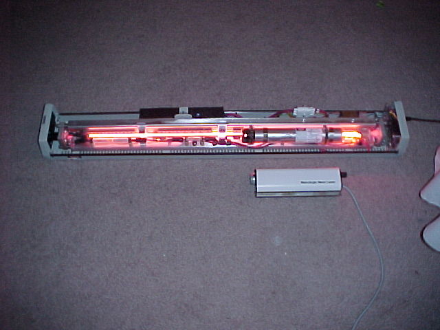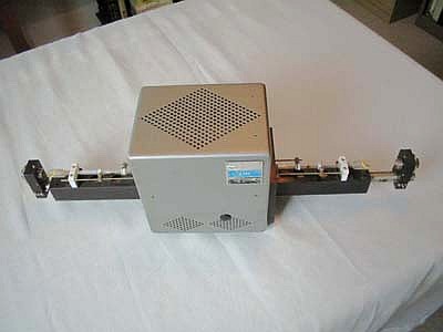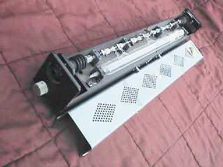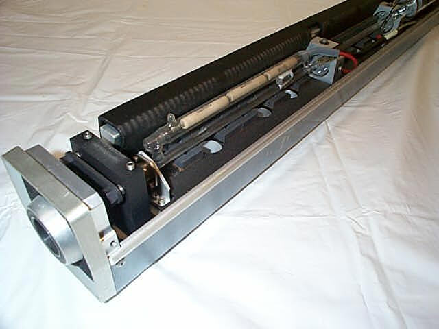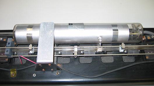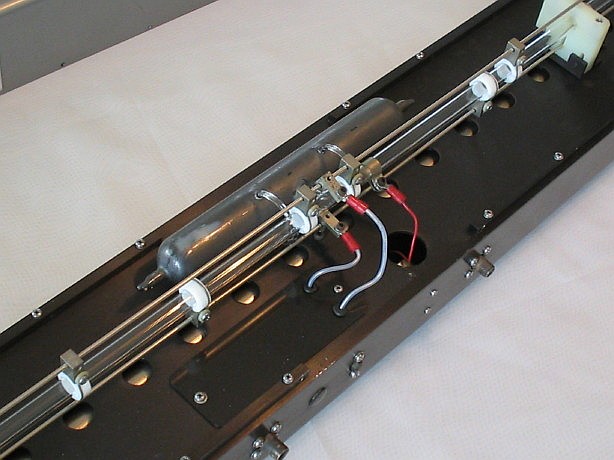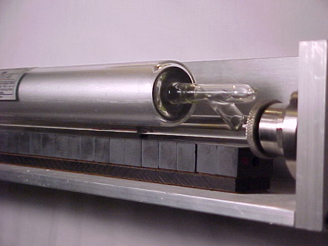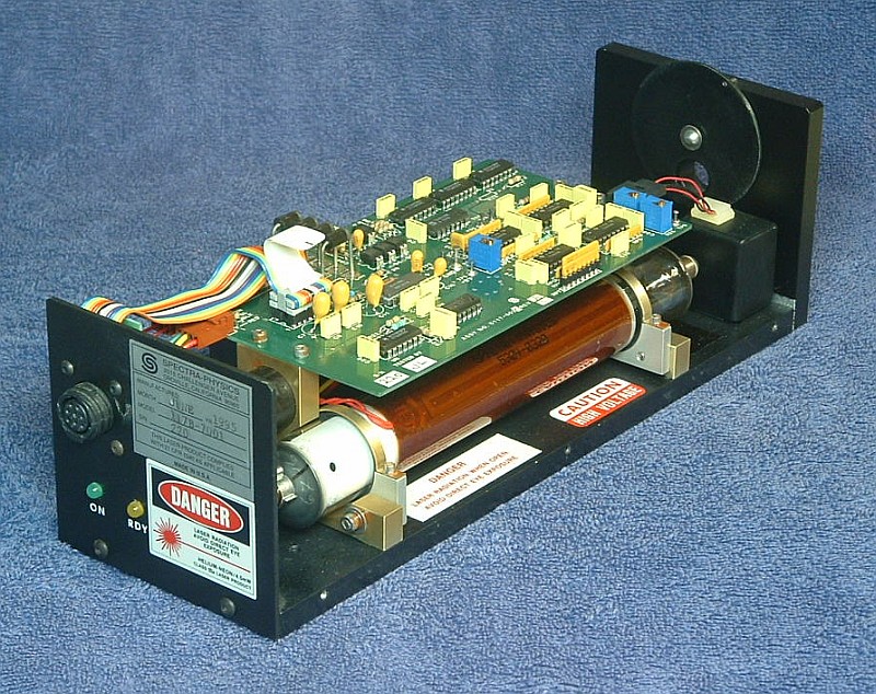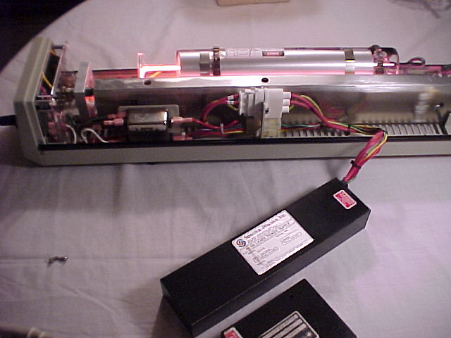 The SP-130B uses a HeNe tube with Brewster windows and external mirrors all in a self contained box. The laser is cute - about 13.5"(L) x 4"(W) x 5"(H) and weighs about 11 pounds (most of the weight being the brute force power supply, chassis, and covers. Well, what else is there?)! Unfortunately, the tube died since the second photo was taken due to unknown (but natural) causes. It would appear that the stress of the thermal expansion of one of the seals after being idle all these years caused it to open up after a few minutes of operation (though the tube had leaked somewhat as well and there was no beam even while there was a discharge glow). I have not yet found the seal problem though. The tube in the other sample was totally dead - up to air showing signs of previous attempts at repair.