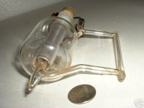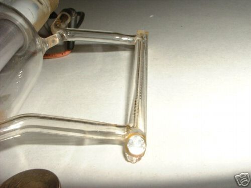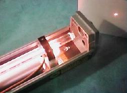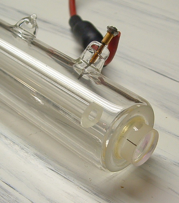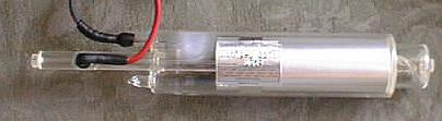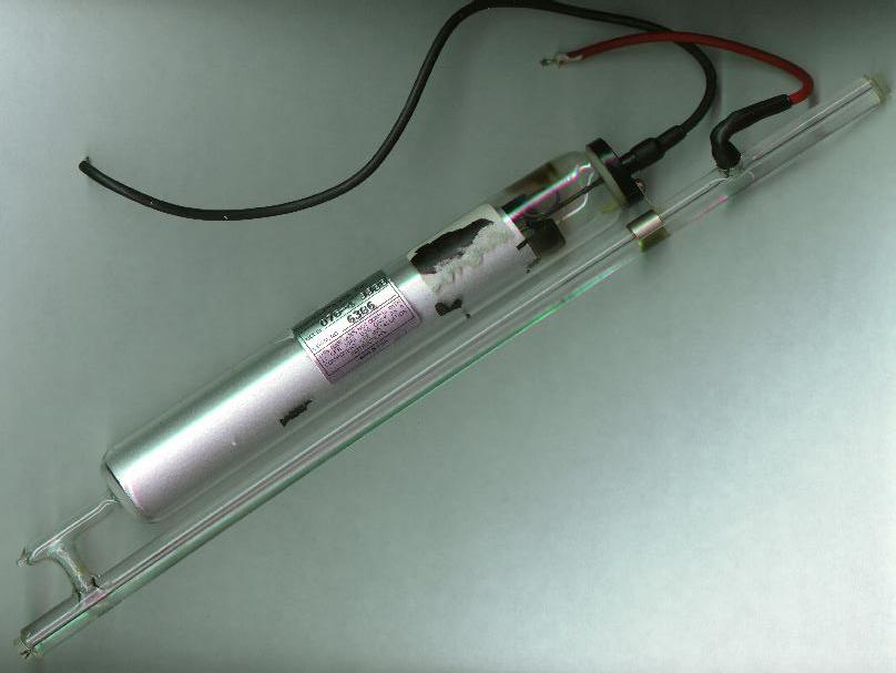 This sample still has a healthy-looking discharge color with an output of around 0.5 mW at 6 mA. The beam diameter at the OC is probably over 2 mm but just a pin-point at the HR. I do not know what the reated power was but although the tube is over 12 inches long, with the wide bore for over half its length, it couldn't have been as high as it would be for a similar length modern tube, possibly 2 or 3 mW. If anyone has more information, please send me Mail.