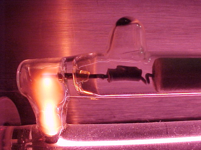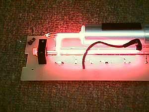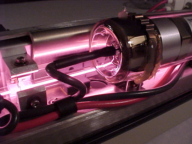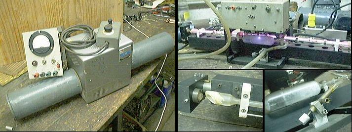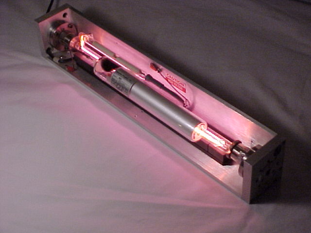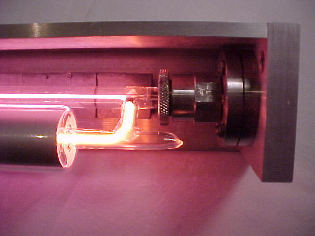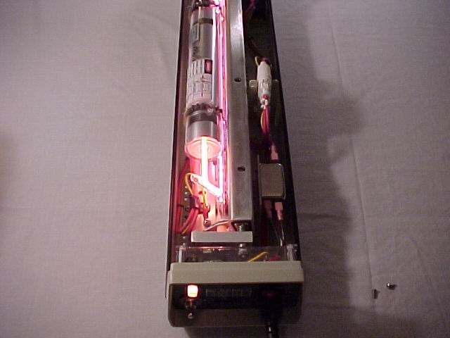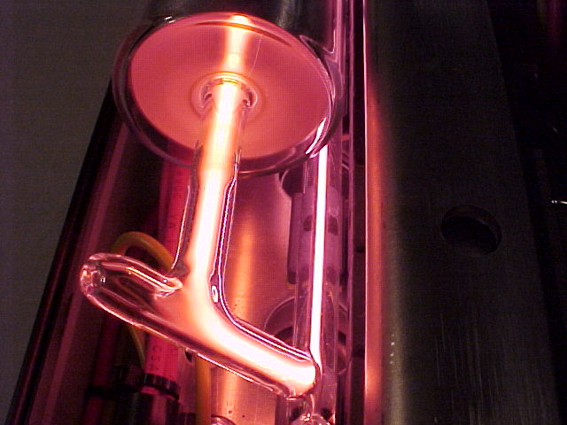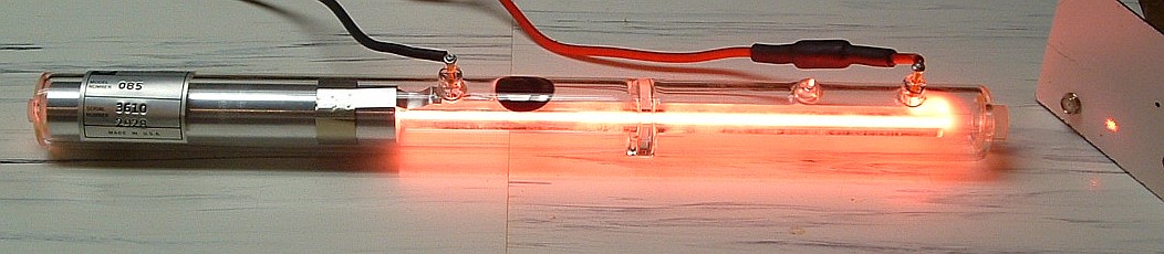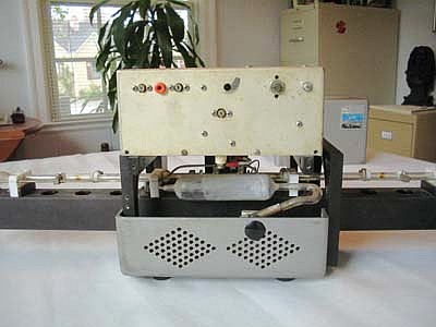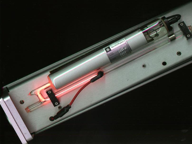 Well, as far as lasers go it's antique! This is one of the first helium-neon lasers available on the market! It is a Spectra-Physics model 110 made back in the 70's when lasers were thought to be dangerous death rays! (I think this was actually more like 1963 or earlier. --- Sam.) This one has an open cavity construction and had an output power that could exceed 15 mw with careful adjustment of the mirrors. This laser uses RF excitation so that there was no electrodes inside the tube. This allowed the testing of gases that would attack metals. This particular laser was used in a laboratory that was investigating different gas mixtures and laser wavelengths. A filling tube has been fused to the plasma tube so it could be attached to a vacuum system and gas charging system. The laser is not in operating condition as it sits because the valve on the filling tube leaks down gradually. The discharge in the pic is from a charge of helium that was put in the tube to test the power supply and oscillator to make sure it still works. Note that to make this laser actually lase, would require access to a vacuum system and proper gas charging system.