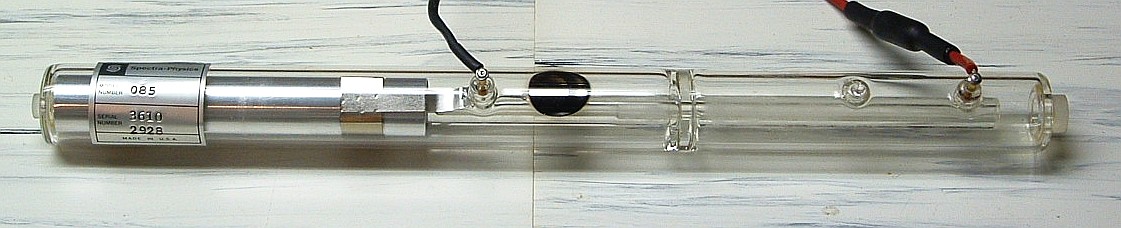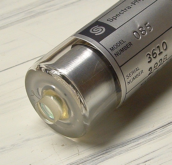 This is a rather old Spectra-Physics two-Brewster HeNe laser tube, used in the SP-119 stabilized HeNe laser. (More information including photos of the SP-119 can be found in Sam's Laser FAQ Chapter: Commercial HeNe Lasers. The overall design is similar to many other SP tubes including the one in the SP-130 laser, but it has a really large gas reservoir and extended glasswork. Perhaps this was before the SP engineers realized that the He and Ne atoms would cooperate and fit into smaller spaces. :) But more likely, the extended glasswork was required to be able to mount the actual bore with the Brewster windows inside a heater jacket. And the large gas reservoir was provided to maximize life as stabilized lasers are often run continuously for years.