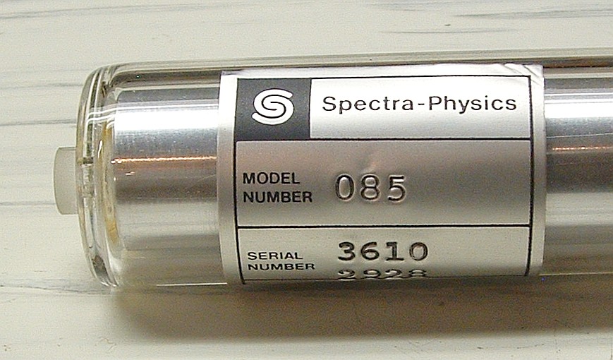 This laser uses a tube nearly identical to the SP-076-4 shown above. However, note that the distance from the anode lead to the cathode side-arm is less than half the total length of the tube. The power output is listed as 0.5 mW. I wonder if Spectra-Physics had a standard model 'small HeNe tube' and customized its output power by the placement of the anode. :) This would result in lasers with the same mode spacing, beam divergence, and stability characteristics. If anyone has a more reasonable explanation, I would like to hear it! (One sample of the SP-155 I have looks exactly like these photos but is tired - 0.3 mW max without trying any rejuvenation as yet.) Another one into which I installed an apparently never used tube does 0.65 mW.