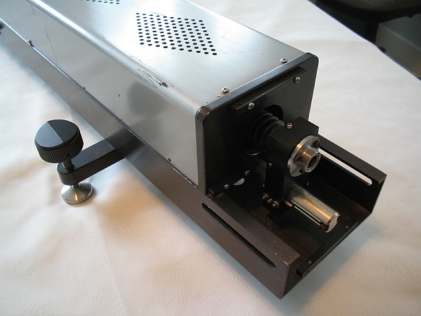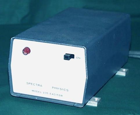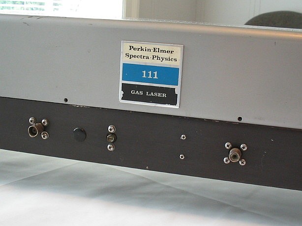 I bought this Perkin Elmer/Spectra-Physics Model 110 HeNe laser from Ron Soyland. The SP-110 was the first CW commercial laser made with a visible beam. The Model 100 was the first commercial CW laser, but it was IR. The first 75 lasers made by Spectra-Physics also carried the Perkin Elmer name. The only other Model 110 I know of is in a display at Spectra Physics. Mine is missing its cylindrical end covers, a power supply and its boots.