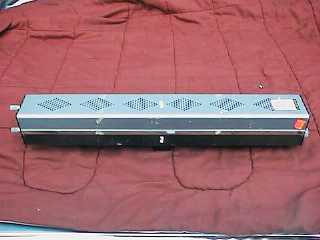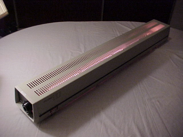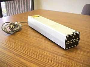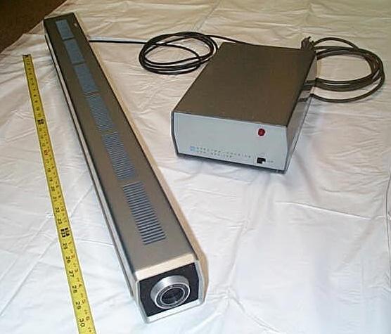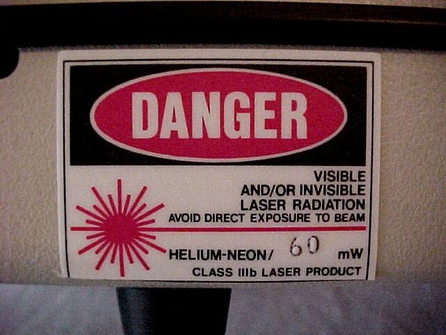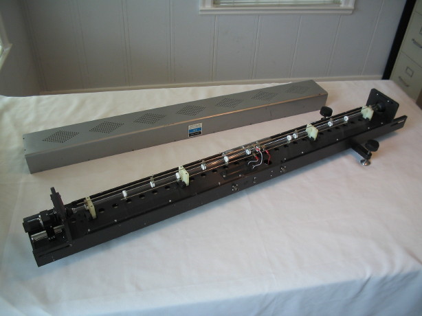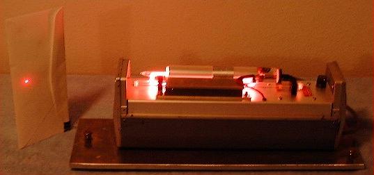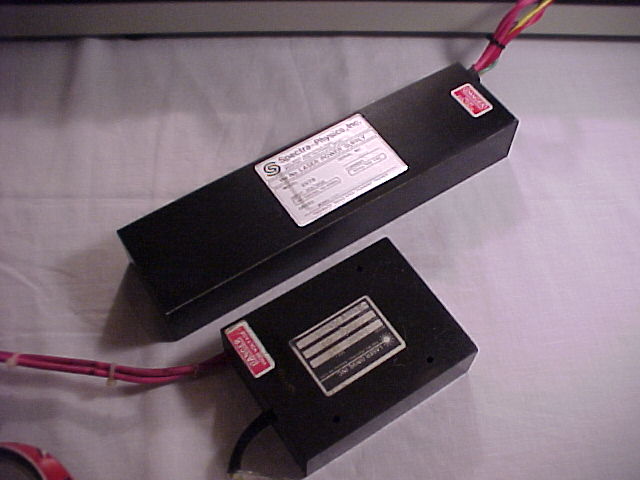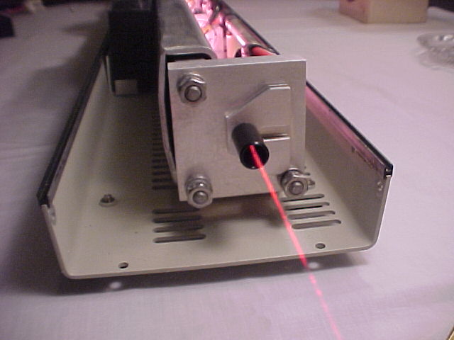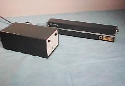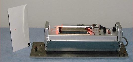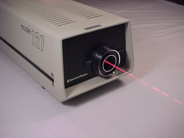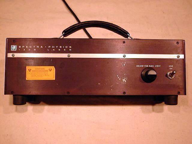 This is also a rather large HeNe laser but not nearly the size of the SP-125. It is self contained with an internal brick type power supply. Rated output power is around 35 mW (CDRH max: 60 mW). The beam cuts through T-120 video tape like butter when focused. Dimensions are: 42-1/2"(L), 5-7/8"(W), 4-9/16"(H) including foot projection. Weight is approximately 20 lbs.