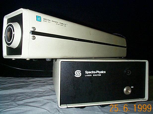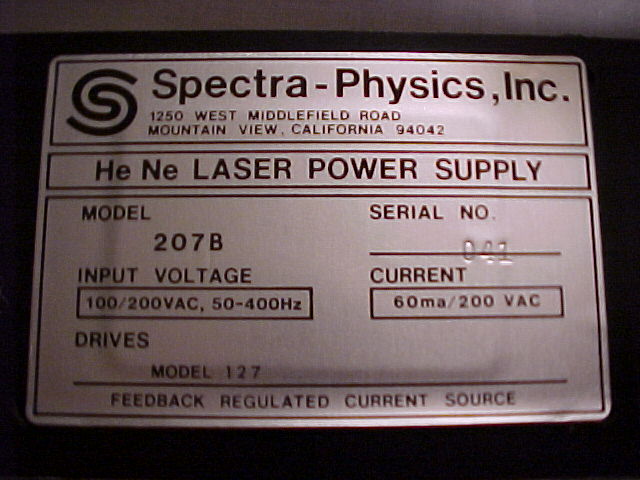 This is the very popular SP-124A "Stabilite" laboratory laser with its SP-255 Exciter. I don't have specs on the expected power output of this model. The minimum guaranteed output power of the SP-124B is 15 mW (red, 632.8 nm) though 25 mW or more may be possible when new. (IR models are also available: option -01 for 1,152 nm, 2 mW; -02 for 3,391 nm, 5 mW.) I also don't know what differences exist between the SP-124/A/B lasers. They appear to be virtually identical physically. If anyone has more information, please send me Mail.