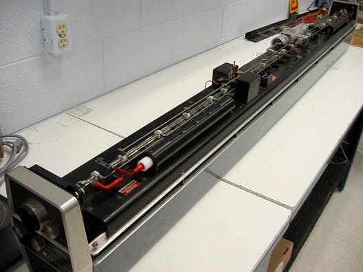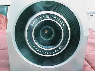 Here is a very old laser, probably from the 60s, latest early 70s. It is RF excited and a nice example of original HeNe technology. The tube is over a foot and a half long with separate bore and gas chambers and is wonderfully mounted with lots of nice machined hardware. It has two RF connectors on the side for the Spectra-Physics model 200 RF-type power supply. An impedance matching network located under the "tube deck" drives a dozen or so electrodes with alternating polarities in proximity to the tube bore. The laser has externally adjustable mirrors, which are truly separate from the tube and joined by removable rubber bellows exposing the Brewster windows. The front mirror has fine adjustments in X and Y via two precision Lufkin micrometers and the rear has a micrometer adjustment for mirror separation (try to find that on any modern laser!).