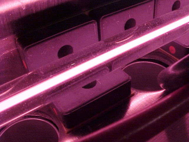 I acquired this laser head 20+ years ago, from a Silicon Valley dumpster-diver, for $200. He needed the cash to get out of jail. It's missing the HR, and there may have been end covers because there appear to be attachment provisions for them. The getter in the tube is intact. I've never even touched the tube with a Tesla coil (don't have one now). I always thought the tube was old. After reading the history of holography and the laser, I've learned that the Model 111 was a run of only 75 lasers produced for Perkin Elmer within 18 months in 1962 and 1963.