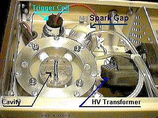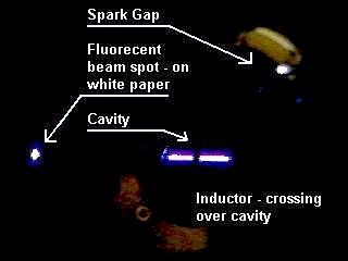 The cavity is only 1.5" in length. This laser sure is a great example of the N2 UV lasing properties. When the spark gap's pressure is too low, the output power drops off substantially. With the spark gap's N2 pressure at atmospheric - it will not even lase. I have been using between 15 to 22 psi in the spark gap. These pressures seem to work well with this laser. With 15 psi, the pulse repetition is more uniform than at 22 psi. The cavity is not sealed so a flowing pressure of +1 or less psi helps keep the output stable.
