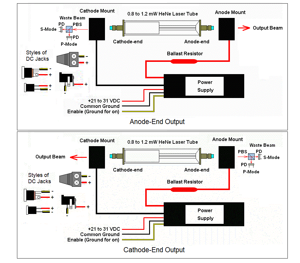 The diagram below shows the wiring for the most common 0.5-1.5 mW 6 inch laser tubes and mounts. It also applies to other tubes that can use the same power supply and brackets. The main beam may exit either from the anode or cathode end of the tube depending on the tube model. (There will also be a much weaker "waste" beam from the opposite end.) But the +HV fat red wire MUST be connected to the anode-end of the tube. So that's the end to avoid touching. The end of the tube from which the main beam emerges can be determined by inspecting the outer surface of the mirror substrate for a bluish purplish Anti-Reflection (AR) coating. This is usually only present on the output mirror.