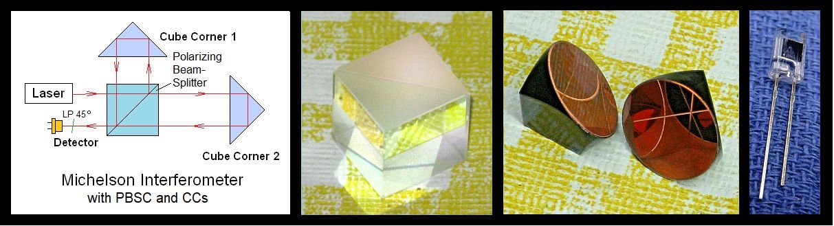 Mich3 consists of a 12.7 mm (1/2 inch) polarizing beam-splitter cube good for 600-670 nm, a pair 12.7 mm (1/2 inch) cube-corner retro-reflector trihedral prisms, a silicon photodiode (PD) to use as a detector, and a piece of linear polarizer (LP) sheet to be used for both forcing a random polarized HeNe laser to output a linearly polarized beam, and to combine the output of the interferometer on the PD.