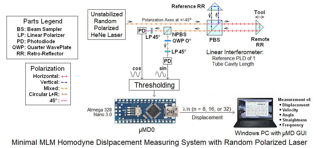 The general organization of two examples of the minimal homodyne displacement measuring systems that can be constructed from these kits are shown below: