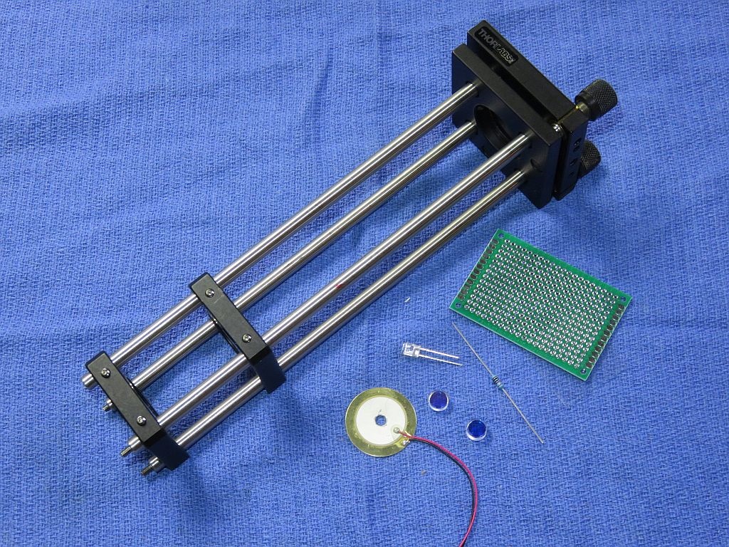 The benefit of the deluxe kits is that in addition to what's in the basic kit, they include commercial parts (mostly from Thorlabs) for the major mechanical assembly so that much of the scavanging for scrap sheet metal and other tid-bits is eliminated. The Thorlabs "Cage System" provides a rigid frame allowing for initial adjustment which can then be locked in place. The completed frame and other parts similar to what's in the planar SFPI kits are shown below.