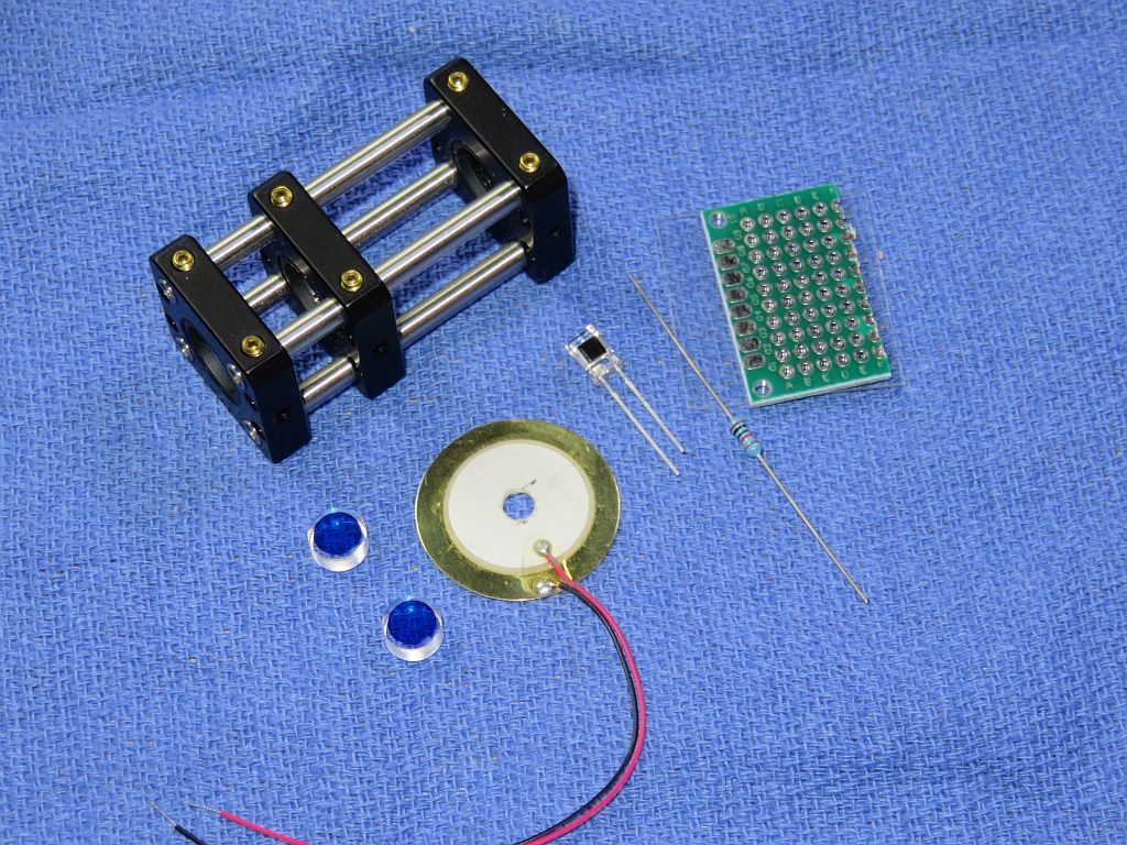 The benefit of the Deluxe kit is that in addition to what's in the basic kit, it includes parts from Thorlabs for the major mechanical assembly so that much of the scavanging for scrap sheet metal and other tid-bits is eliminated. The Thorlabs "Cage System" provides a rigid frame allowing for initial adjustment which can then be locked in place. The completed frame and other parts are shown below.