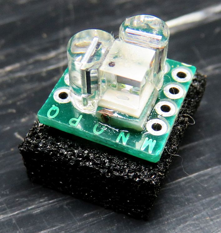 Secure this assembly to the rear cage plate along with insulator if used and the Perf. board using the plastic M2.5 screws and nuts. Adjust the position so that the active area of the photodiode is centered.