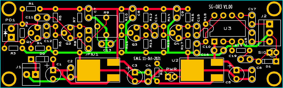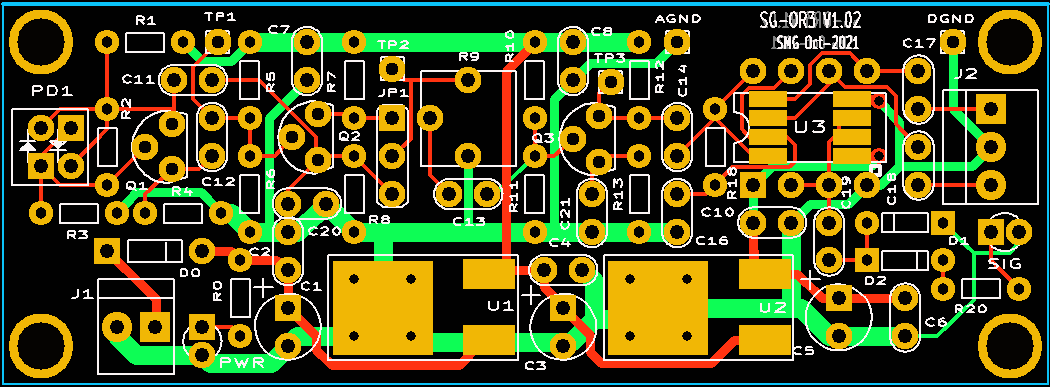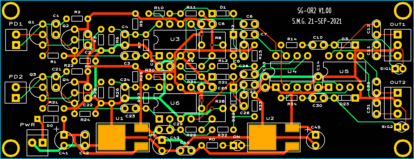 Originally, it was thought that the Teletrac reference receiver could be enhanced to be suitable as a general purpose optical receiver as it is very simple. But SG-OR1 turned out to be more trouble than it was worth. The first new design was SG-DOR1, a dual receiver on a single PCB using amplifiers with with automatic gain control so no adjustments would ever be needed. But the goal has been scaled for several reasons (though SG-DOR1 is described at the end of this manual). One issue has been oscillation of the AGC amp when the input signal is too low. This may be resolved eventually, probably by a better layout on a 4 layer PCB. But another is that having 2 channels on one PCB is less than optimal as extending the wiring to either or both PDs does add noise and RFI pickup even with shielded cable. So the most likely one to be released initially (or forever), will be SG-OR3.