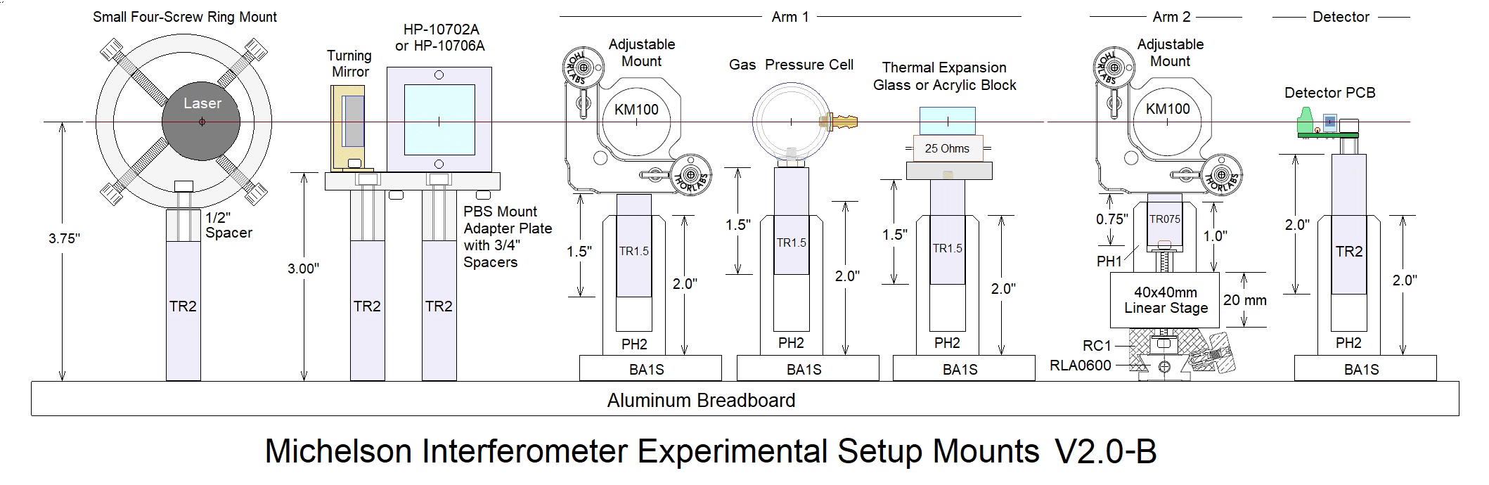 There is no need to construct all of the interferometer configurations described below. Doing the Linear Interferometer (LI) first makes sense since there are detailed instructions on its construction, alignment, testing. Building the High Stability Plane Mirror Interferometer (HSPMI) would be the logical next step moving from cube corners to plane mirrors. It also permits the loudspeaker and/or PZT actuators to be added. Then after that one of the others. Perhaps coordinate with the other project students using this same kit so that each of you do different ones.