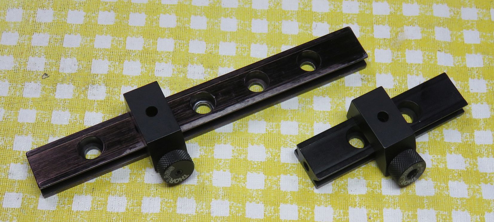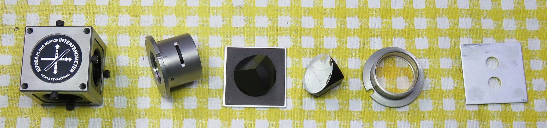 But first are annotated photos of the V2.1 setups for both Homodyne and Heterodyne with all the optics on the PBS cube for reference. V2.0 is virtually identical except for the height of the optical centerline. V1.0 and V1.5 (homodyne only) will be generally similar except primarily for the custom un-anodized breadboard and classy wood block PBS mount. But this should serve for parts identification. Click on the relevant annotated graphic for a high resolution view displayed in a single new window or tab depending on your browser's settings.