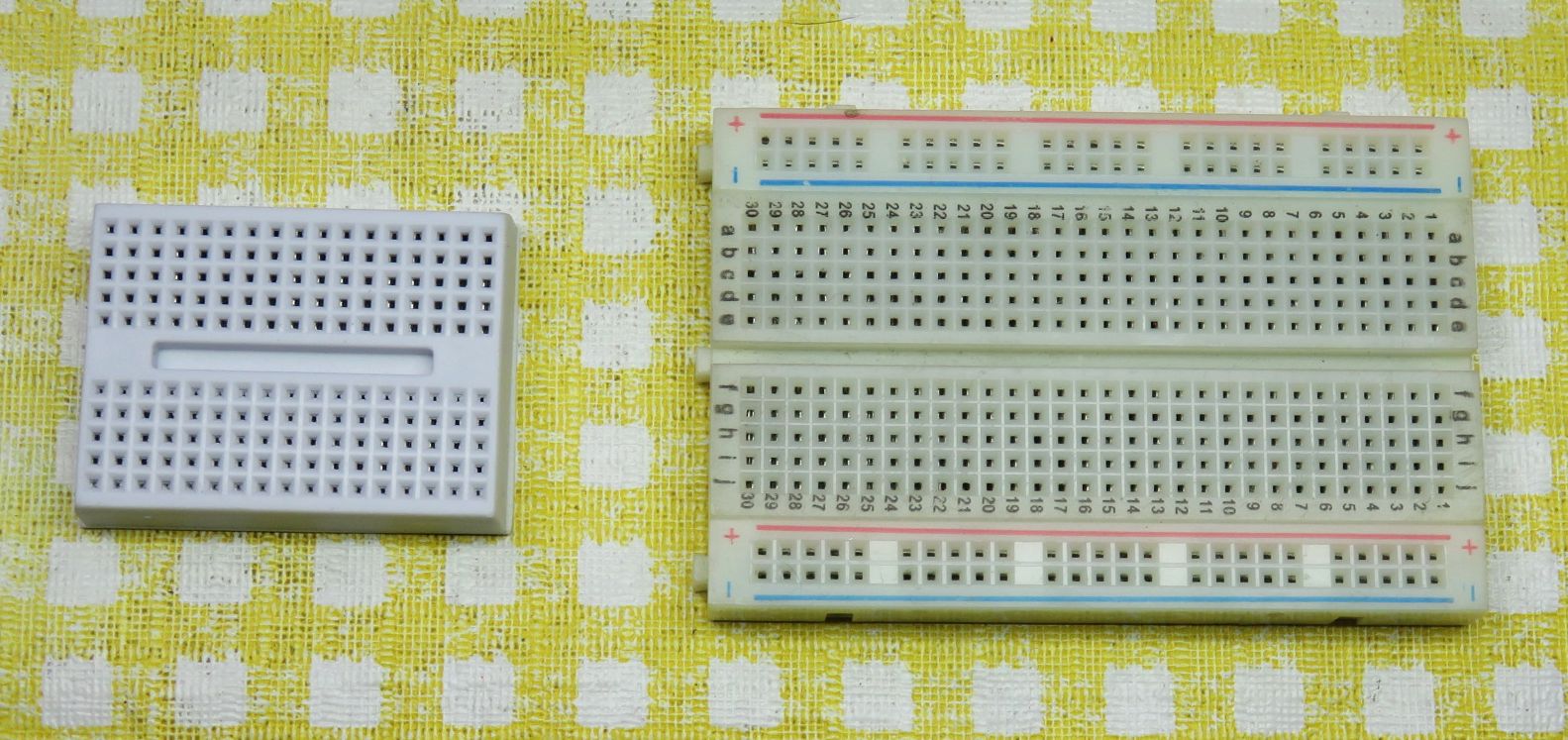 The ones used mostly here will look similar to the top example with the 4 band code and are rated at 1/4 watt with a body around 1/4 inch long. Their leads may be trimmed to conveniently fit the solderless breadboard (or PCB if used).