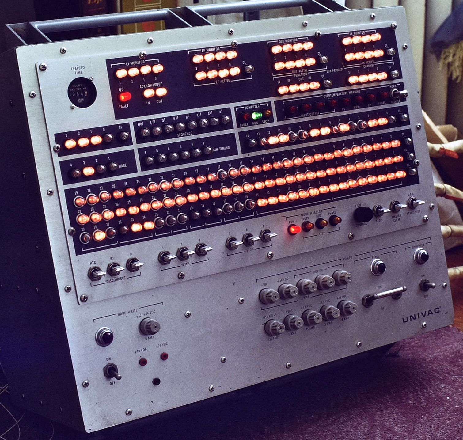 The Operator's Console fully satisfied my requirement that any true digital system be outfitted with a slew of switches and lights (though this one is less impressive than some non-portable computers of the day). It has around 180 indicators/buttons. These each consist of a neon lamp and most are also a push-button switch for toggling a bit or changing the computer's state.