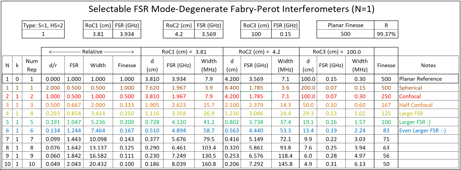 Here are the available spherical resonances up to N=10 sorted by decreasing mirror spacing. To keep it simple, the parameter "k" is set to 0 (the planar special case) or 1. Mirror spacings of 1.0 relative to confocal or less are often more useful being able to either reduce the size of an instrument or provide a larger FSR. Mirror spacings of more than 1.0 may be useful to provide smaller FSRs. The Planar cavity 1-0 at the top with the same mirror spacing as the confocal cavity (d = RoC = 3.81 or 4.2 cm depending on the mirrors) would have an FSR of 2.0 x the confocal FSR (CFSR), but is much more difficult to align and use. while this instrument could be loaded with planar mirrors and have a continuous range of FSRs, alignment would be really tricky.