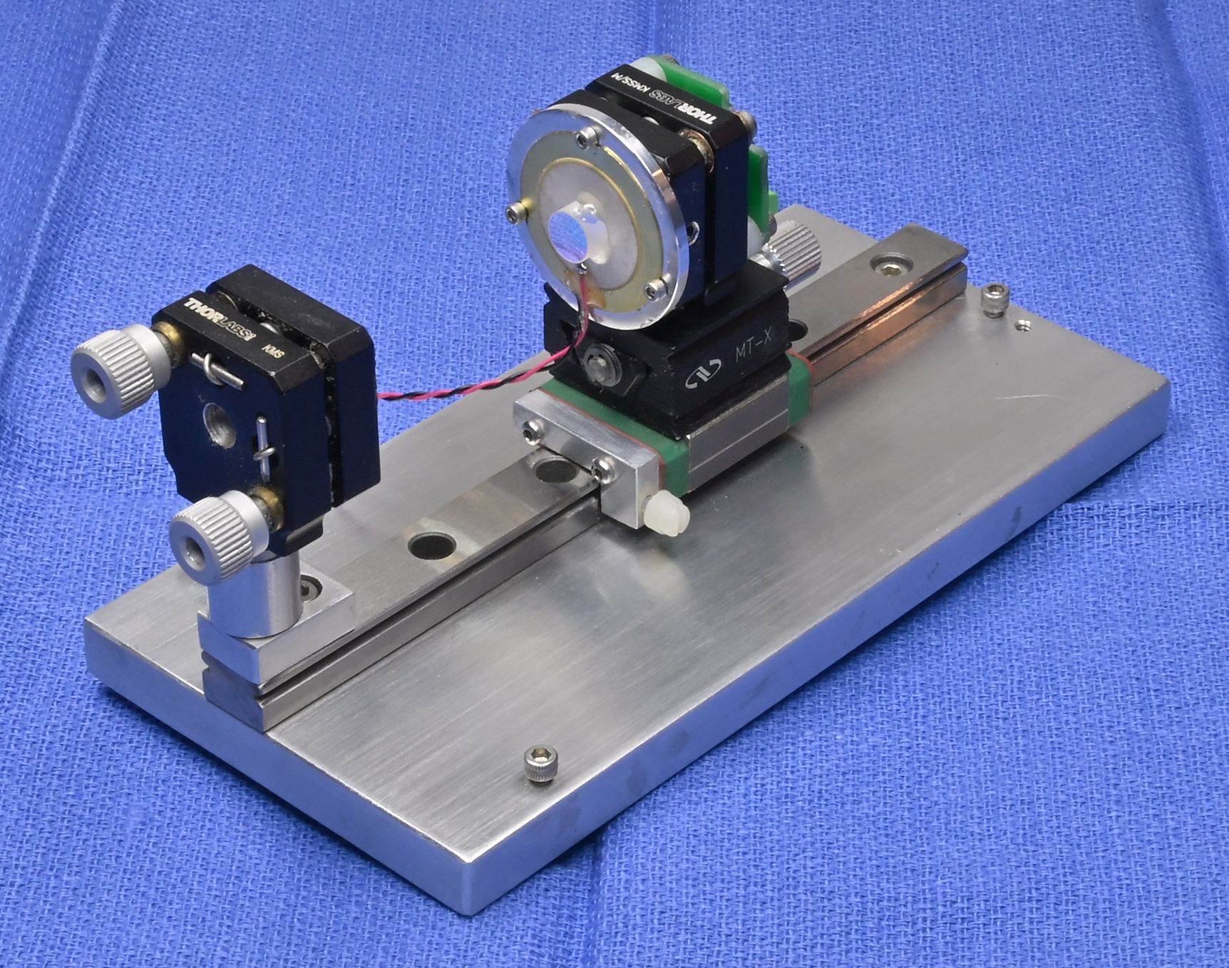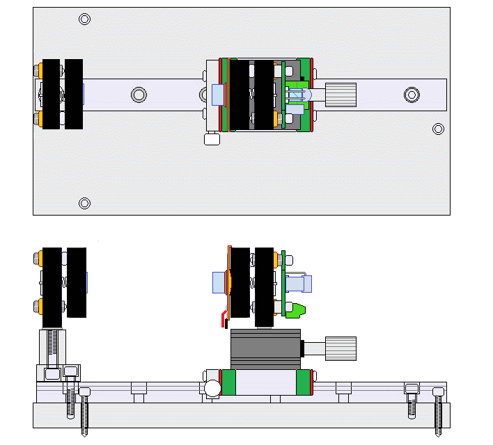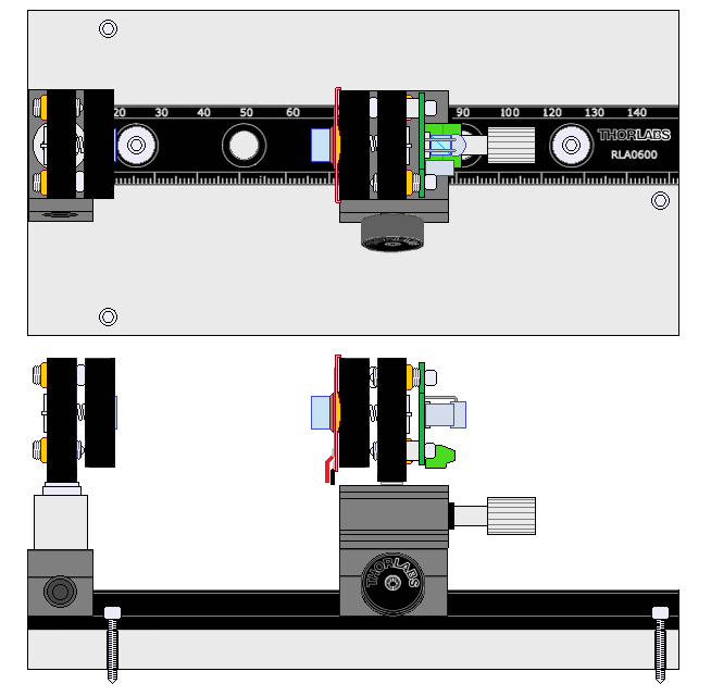 The MGN12 ball bearing rail version allows for very smooth movement but is more complex to assemble and locking is not as secure as with the Thorlabs RC1 carrier. Everything is held together with screws except for the joint between the linear slide and MGN15 carriage, which may use 5 minute Epoxy. I was not able to drill a mounting hole in the steel carriage block. :( Take care that the translation stage is perfectly parallel to the carriage block as that will impact alignment as the spacing is changed. An adapter plate could be fabricated if desired with four countersunk holes for the carriage block and a central 8-32 tapped hole for the translation stage. But that would increase the height of the front mirror.