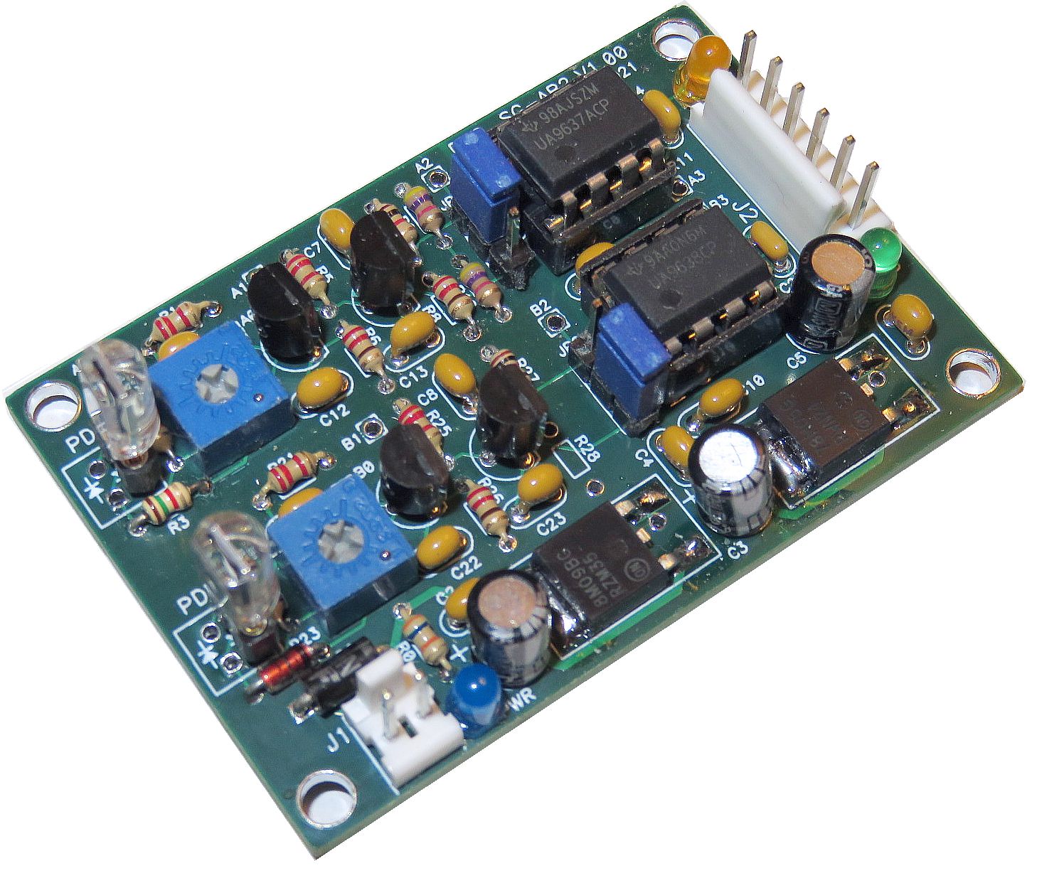 While the photodiodes are shown plugged into sockets on the PCB, in actual