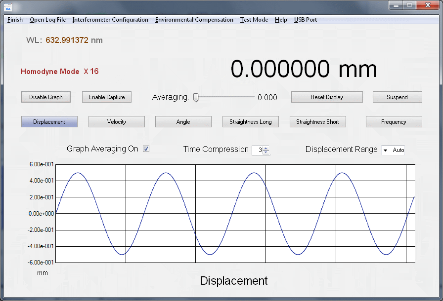 When started, the µMD2 GUI (henceforth simply called the "GUI") comes up in Displacement mode with graphing enabled. The only action required by the user is to select the USB COM port. Once selected, the readout and graph will begin displaying the interferometer data.