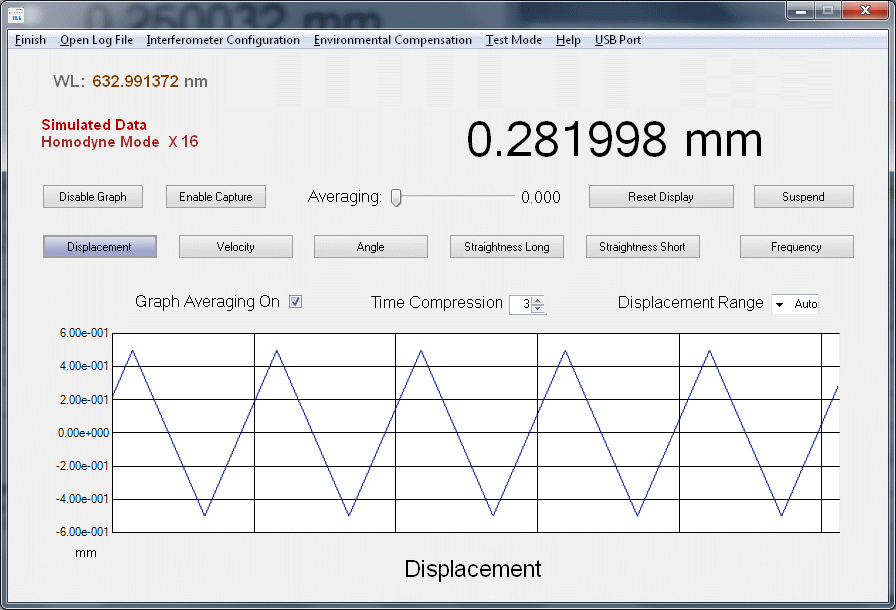 Assuming the use of a Plane Mirror Interferometer (10706A) with a Homodyne Multiplier of 4 ("#define HomodyneMuliplier 4" in the firmware), the Displacement would be 51643 * 39.56 nm or approximately 2.043 mm.